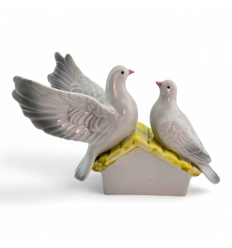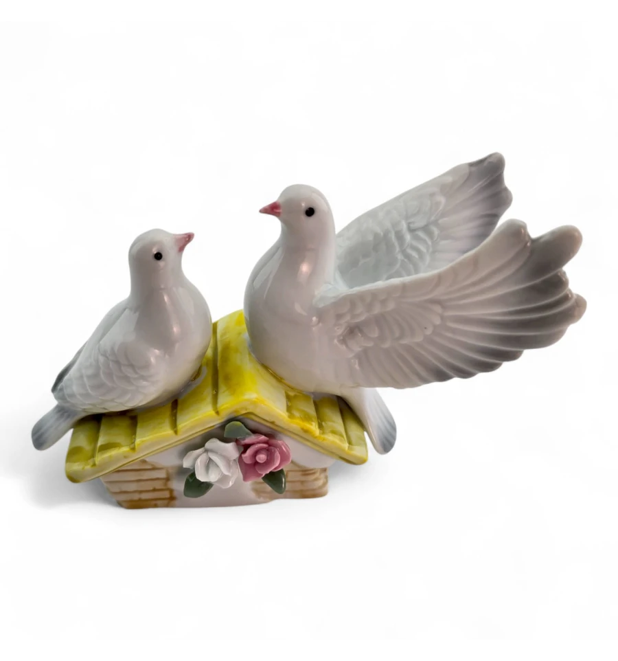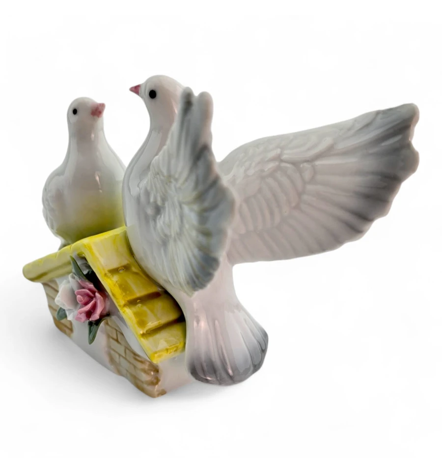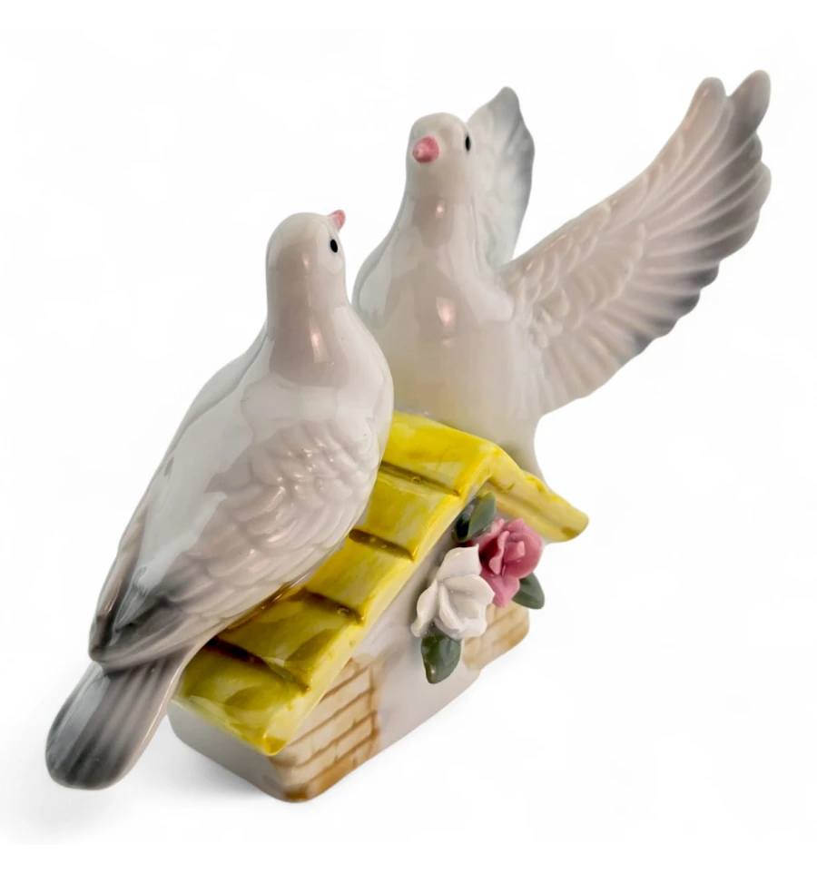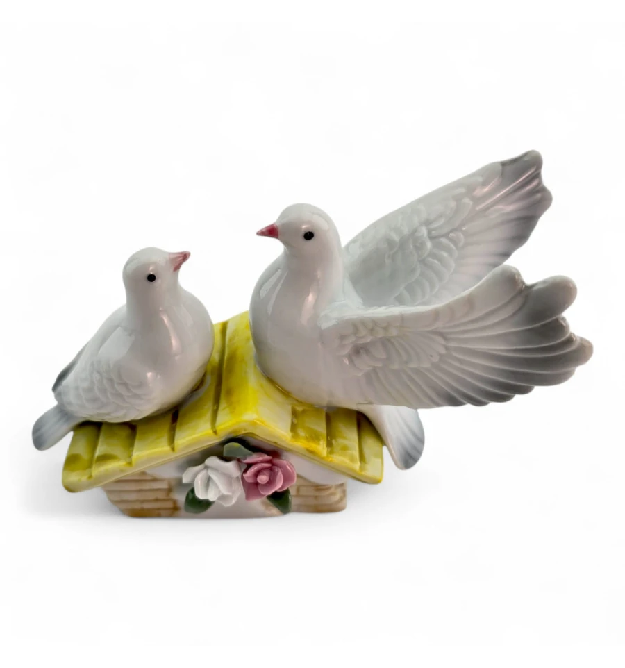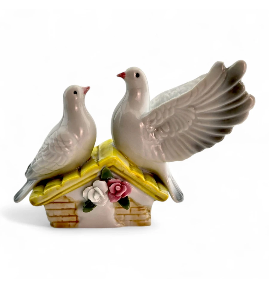 Витончена керамічна статуетка з двома голубами на даху з квітами. Символ миру та кохання, який стане ніжним акцентом у вітальні, спальні чи на весільній фотозоні. Компактний розмір зручний для полиць та комодів, гладка поверхня легко протирається.