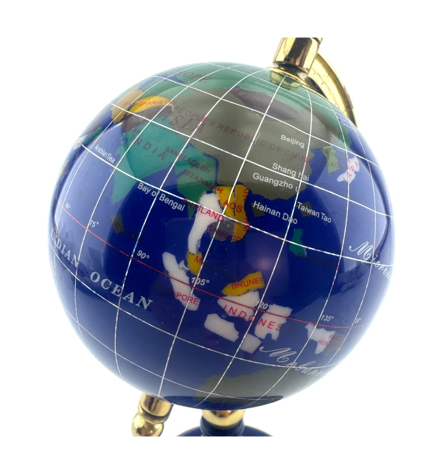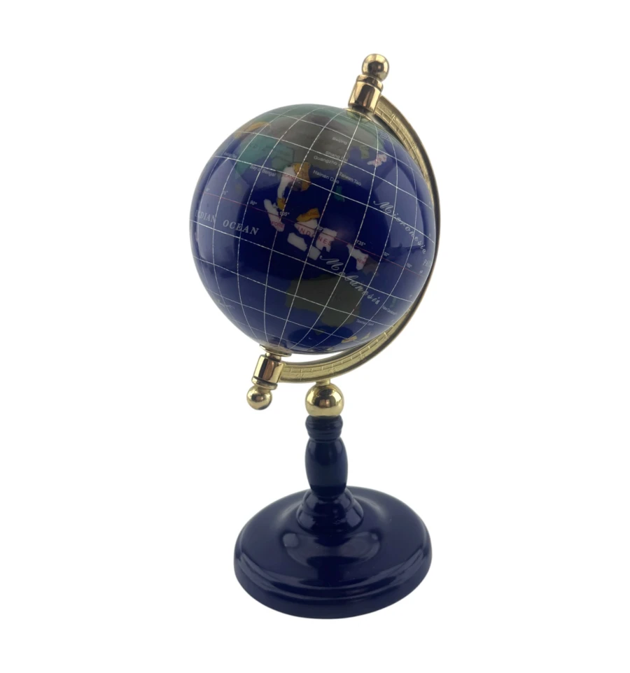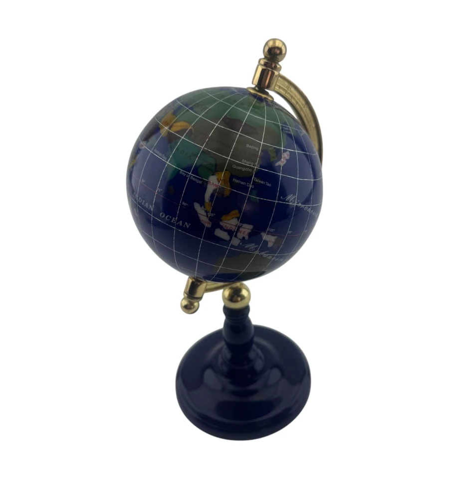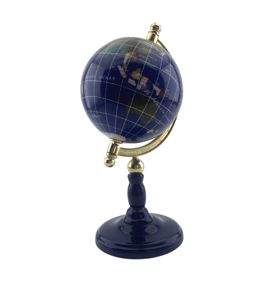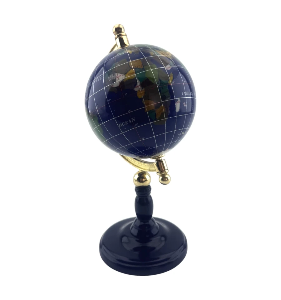 Витончений декоративний глобус, виконаний у класичному стилі, стане яскравим акцентом в інтер'єрі чи гідним подарунком. Поверхня глобуса інкрустована камінням, що надає йому особливої елегантності та витонченості. Підставка з каменю із золотистими елементами гармонійно доповнює композицію.