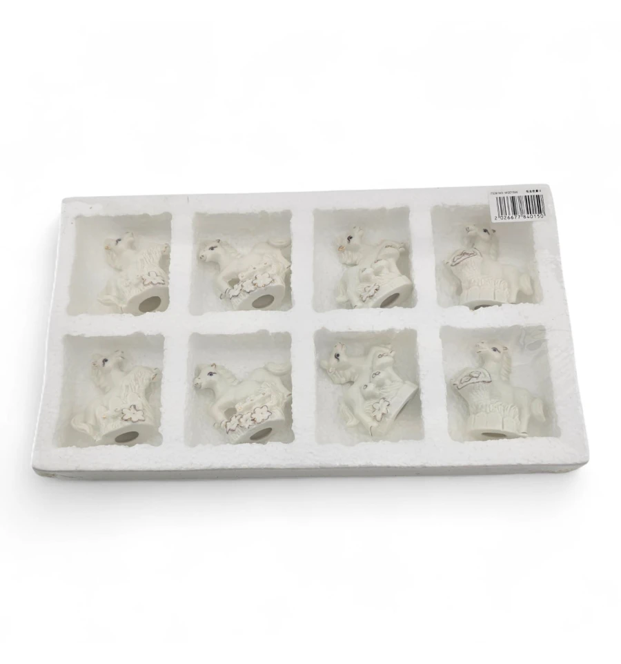 Елегантні порцелянові фігурки коней з квітковим декором. У наборі 4 види по 2 штуки кожного, всього 8 статуеток. Біла глянсова глазур з делікатними золотистими акцентами підходить для класичного інтер'єру та святкових композицій. Підійдуть для полиці, камінної або як приємний сувенір. Можливі невеликі розходження ручного декору.