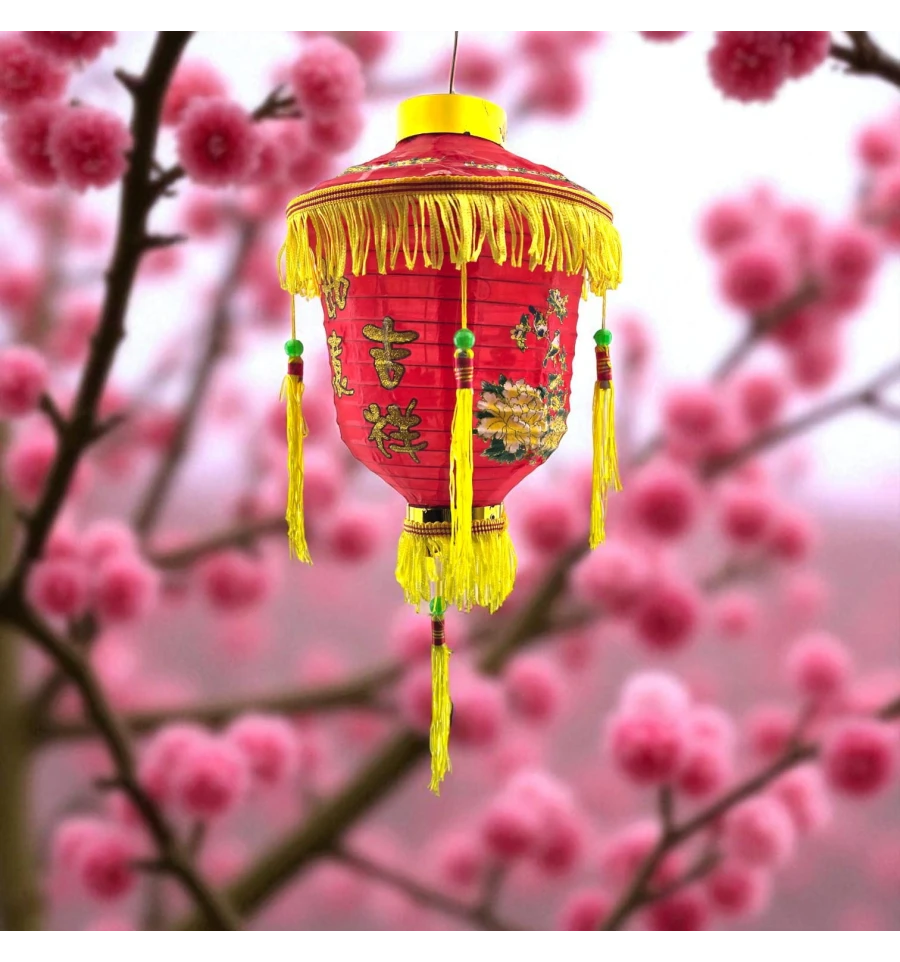 Традиційний китайський червоний ліхтар для святкового оформлення інтер'єру, вітрини або фотозони. Прикрашений золотистою бахромою, пензлем та орнаментом. Легко підвісити за гачок. Використовується як декоративний елемент.
