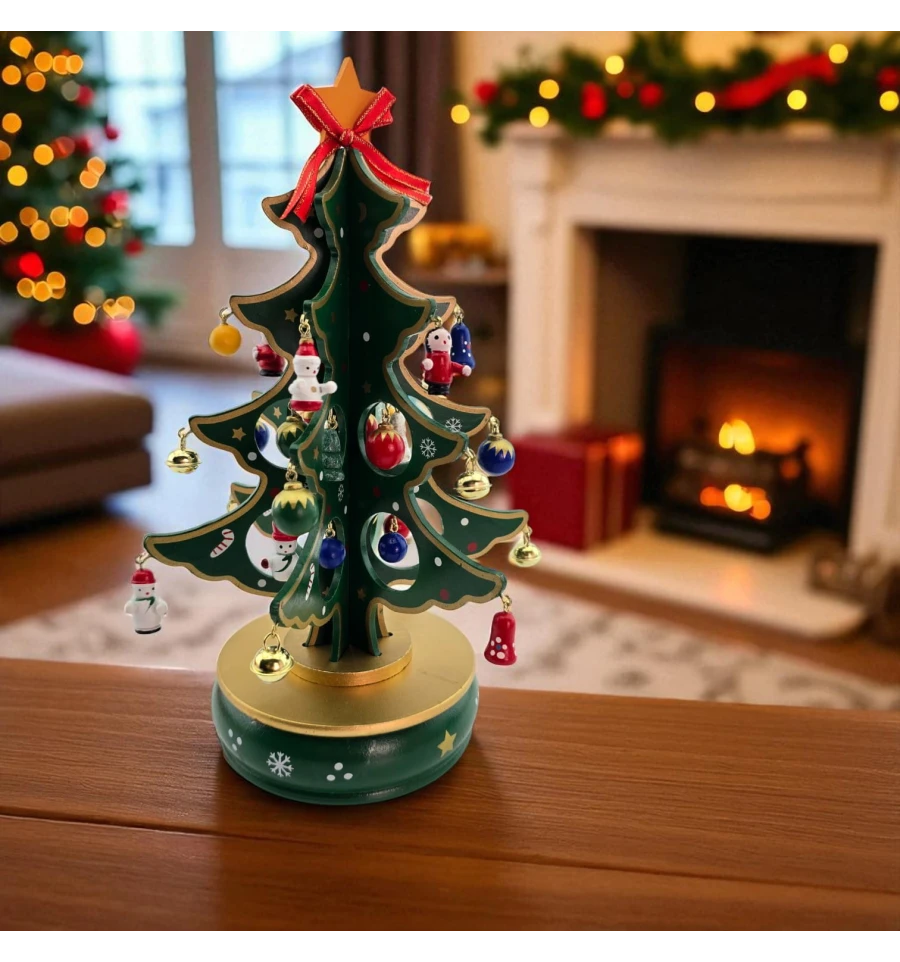 Настільна дерев'яна ялинка з музичним механізмом – затишний святковий декор для дому чи офісу. В основі - механічна скринька: поверніть ключ знизу, і ялинка заграє мелодію. Конструкція складається з двох половинок, зверху зірка із червоною стрічкою. У наборі є підвісні міні-іграшки та дзвіночки на гачках. Складання займає кілька хвилин без інструментів. Дизайн підвісів може трохи відрізнятись від фото.