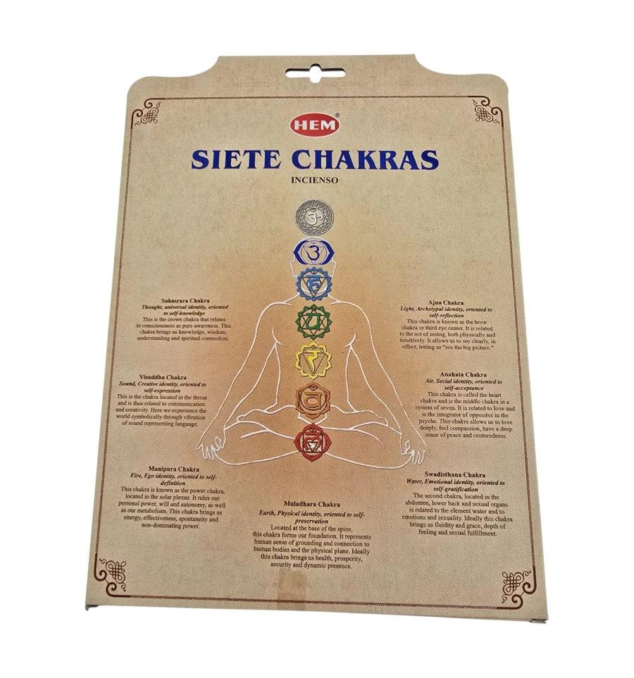 HEM Seven Chakras індійський набір масала-паличок для гармонізації простору, медитації, йоги та домашнього затишку. Усередині сім окремих упаковок, кожна присвячена одній із чакр. Палички тліють рівно і дають м'який стійкий аромат. Чудово підходить як готовий подарунок.