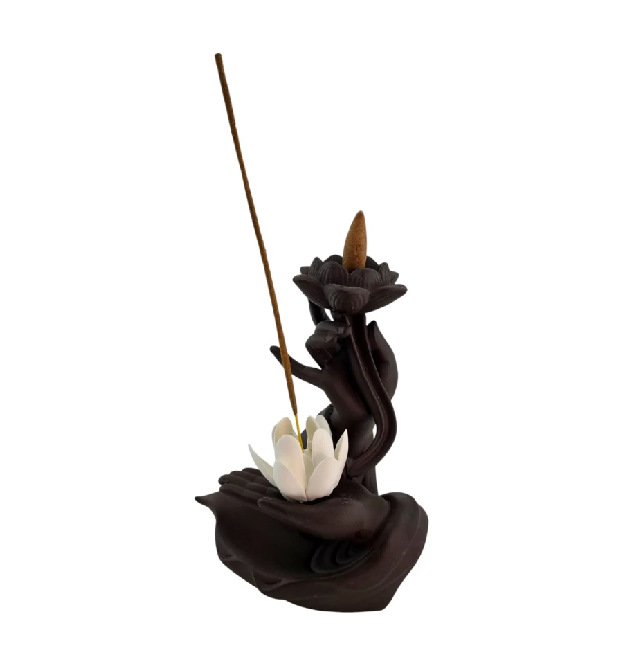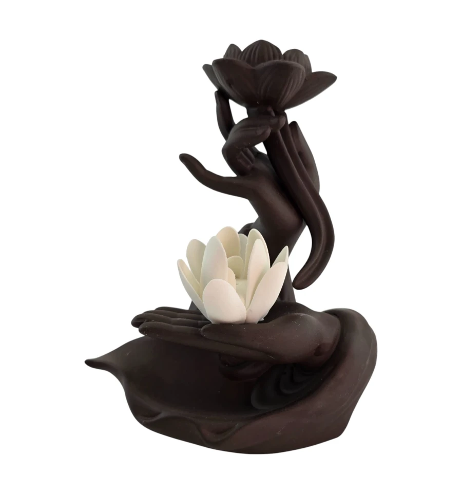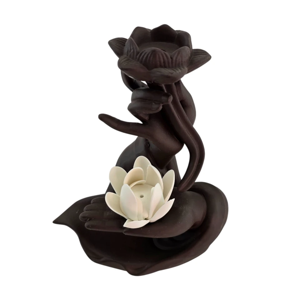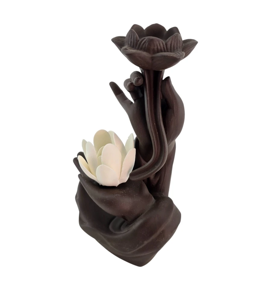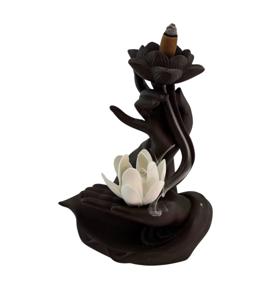 Естетична керамічна підставка у вигляді долоні з білим лотосом та квіткою зверху. Підходить для паличок і конусів пахощів: паличка встановлюється збоку, конус ставиться у верхню квітку. Форма спрямовує дим м'якими завитками та захищає поверхню від попелу. Підійде для домашнього вівтаря, куточку медитації, йога-студії або як приємний подарунок любителям аромотерапії. Можливі невеликі відмінності відтінків та фактури.