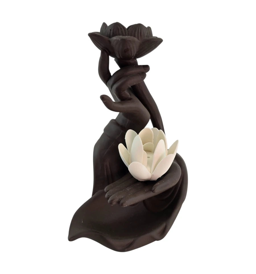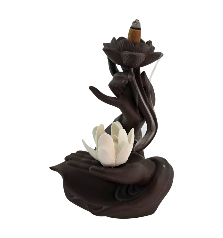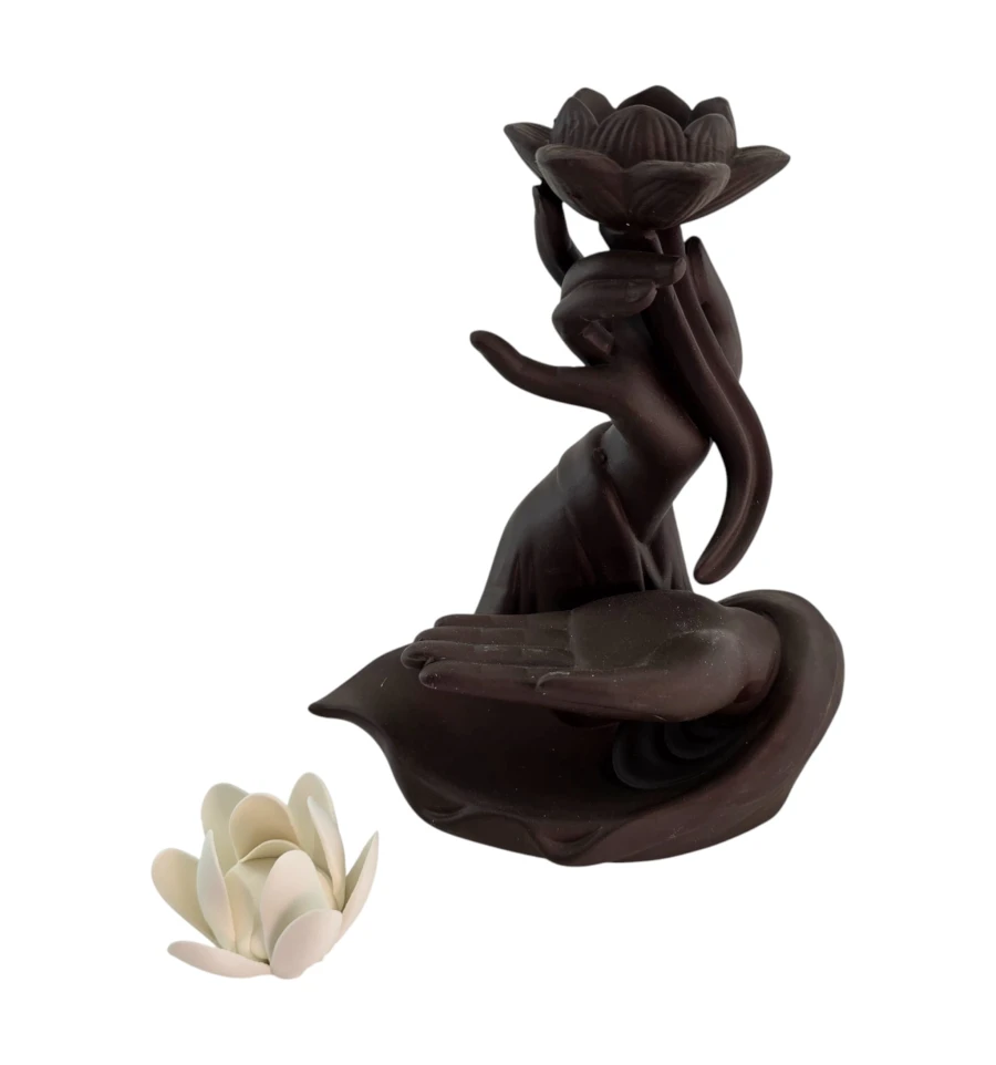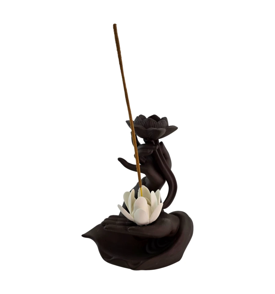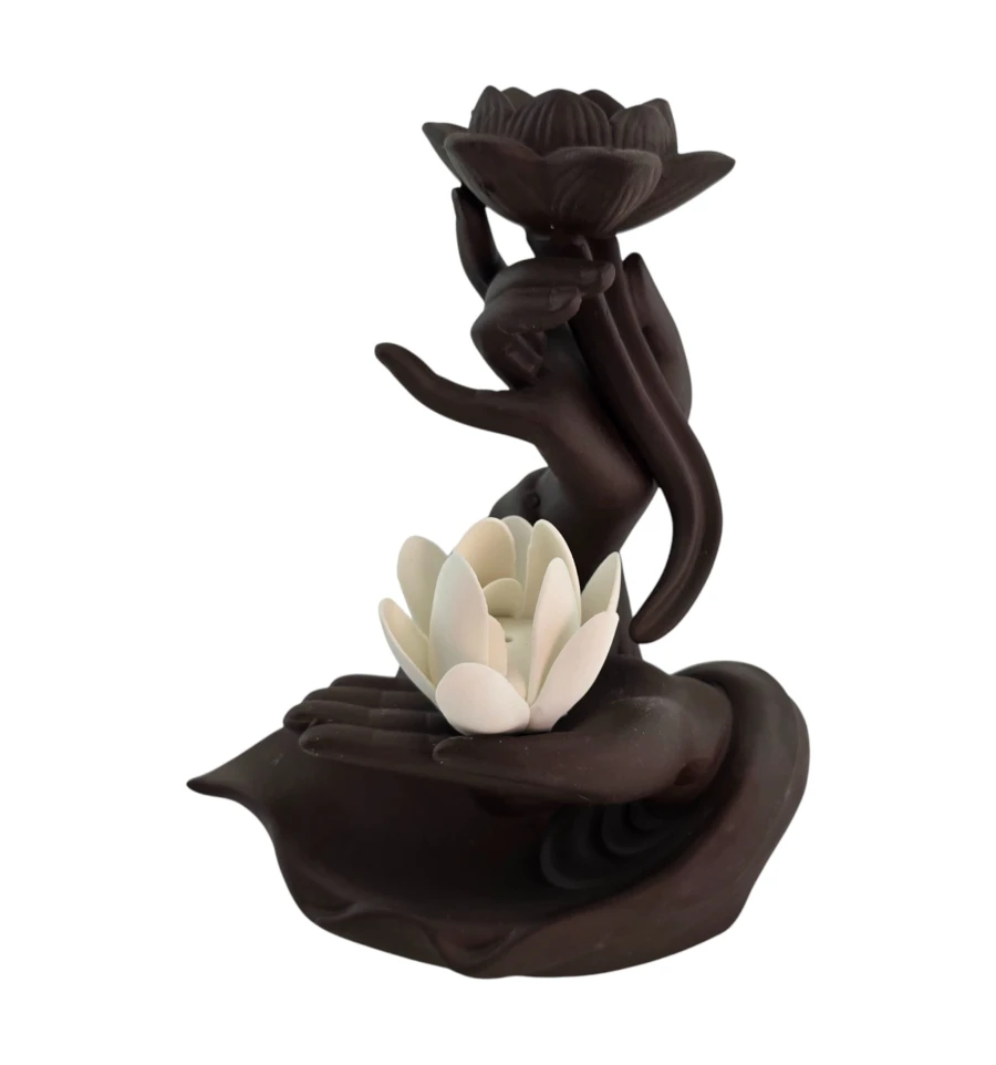 Естетична керамічна підставка у вигляді долоні з білим лотосом та квіткою зверху. Підходить для паличок і конусів пахощів: паличка встановлюється збоку, конус ставиться у верхню квітку. Форма спрямовує дим м'якими завитками та захищає поверхню від попелу. Підійде для домашнього вівтаря, куточку медитації, йога-студії або як приємний подарунок любителям аромотерапії. Можливі невеликі відмінності відтінків та фактури.