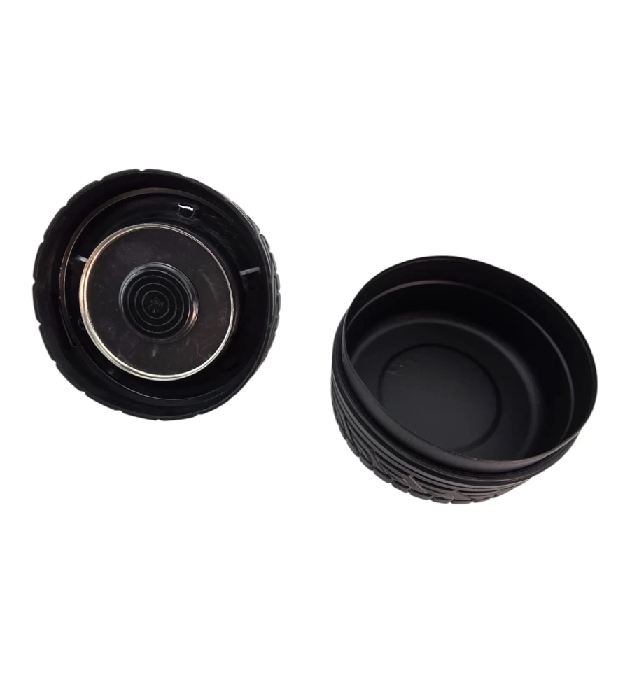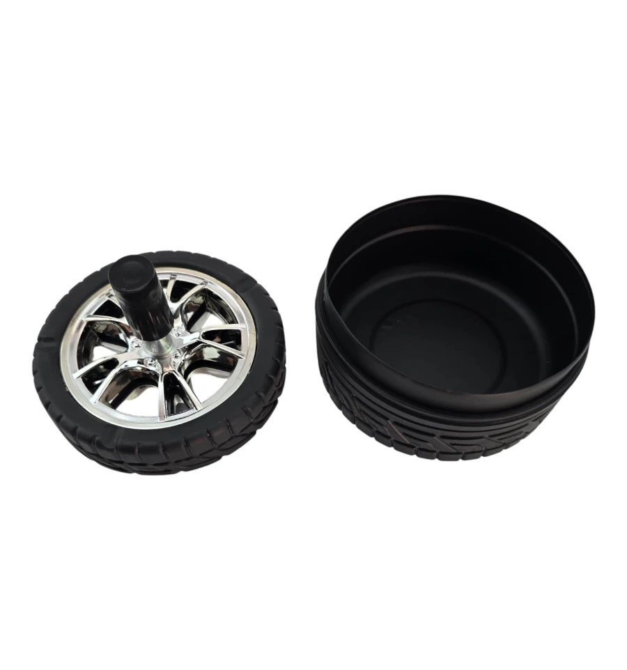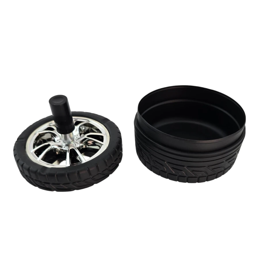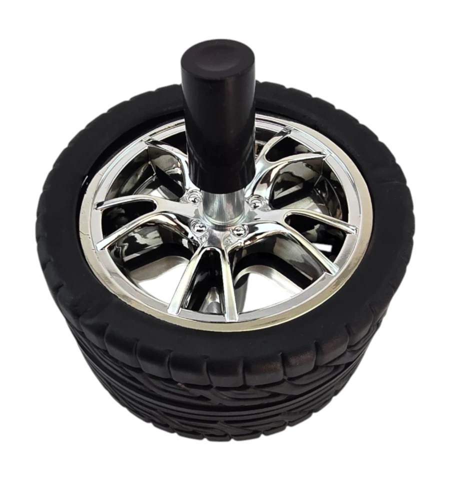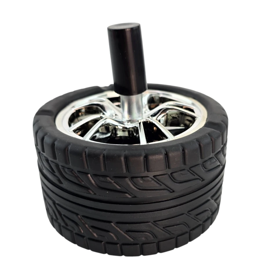 Ефектна попільничка для любителів авто-тематики. Корпус оформлений як стопка шин з реалістичним протектором: зверху металева чашка з прес-механізмом, диск - пластиковий з хром-блиском, шини - гумові. Натисніть кнопку - кришка провертається, попіл і недопалки потрапляють усередину. Менше запаху та протягів, поверхня навколо залишається чистою. Підійде для дому, тераси, гаражу; чудовий подарунок автомобілісту та декор для бару чи кав'ярні в авто-стилі.