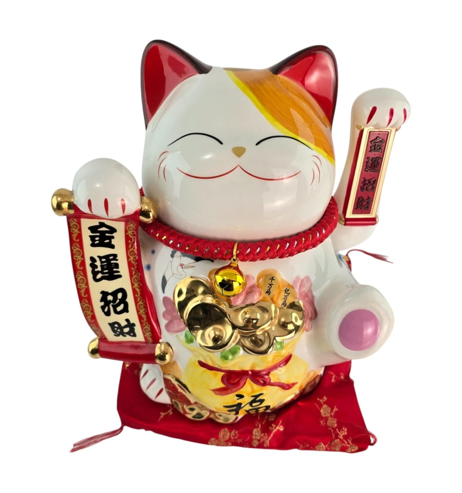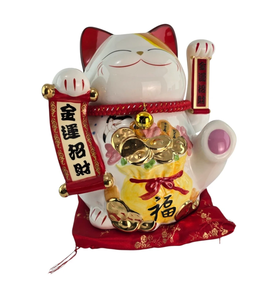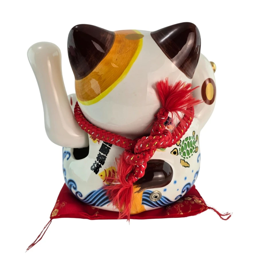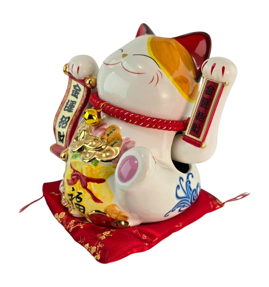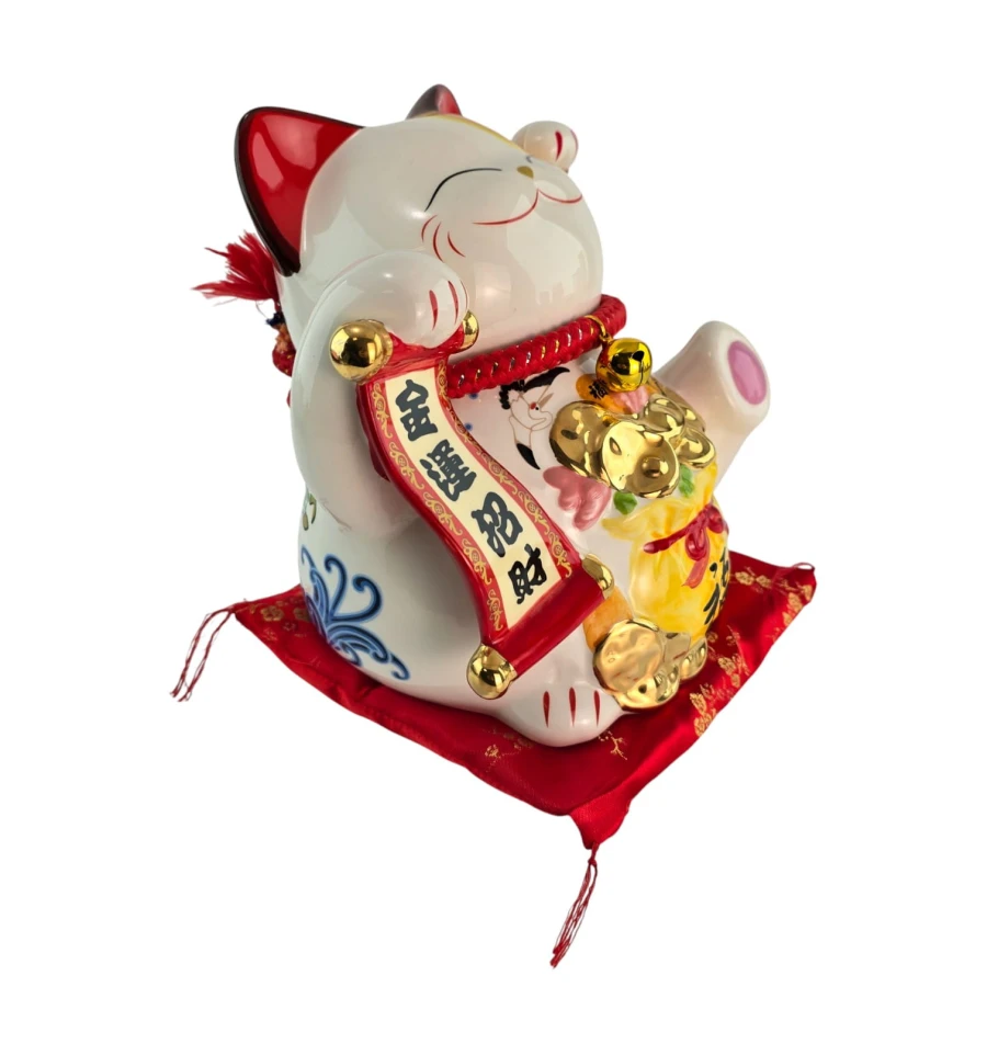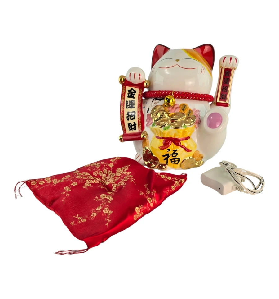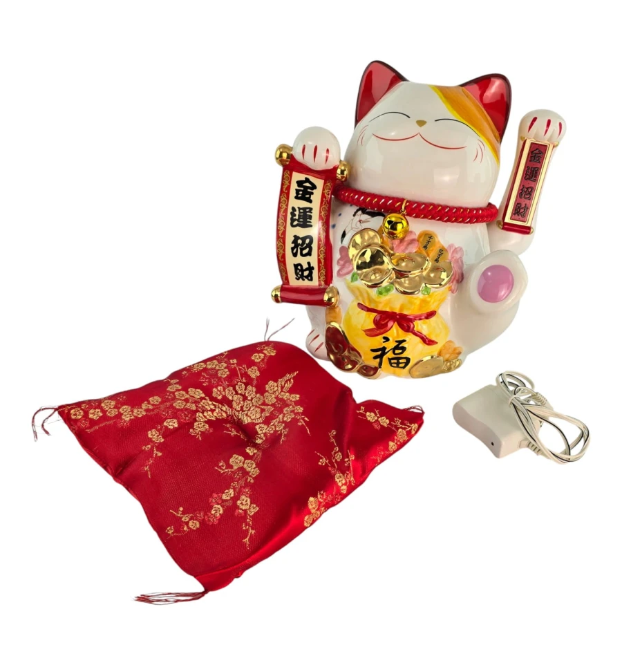 Модель оснащена лапою, що махає (живлення від мережі або батарейок), має глянсову керамічну обробку із золотистими монетами і поставляється з декоративною подушечкою - готовий подарунок для дому, офісу, магазину, салону або кав'ярні.