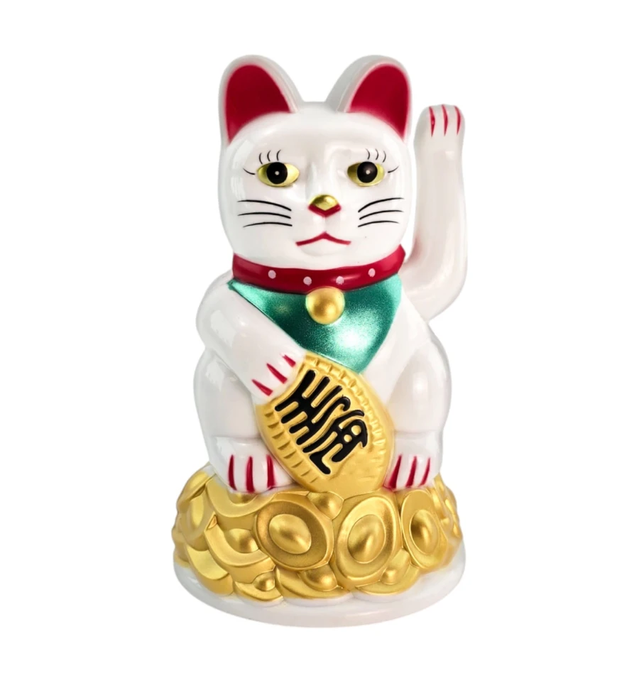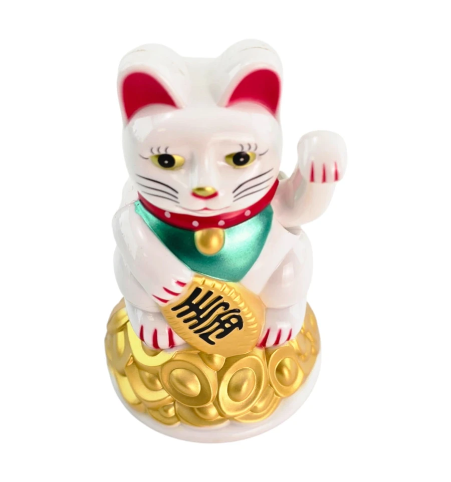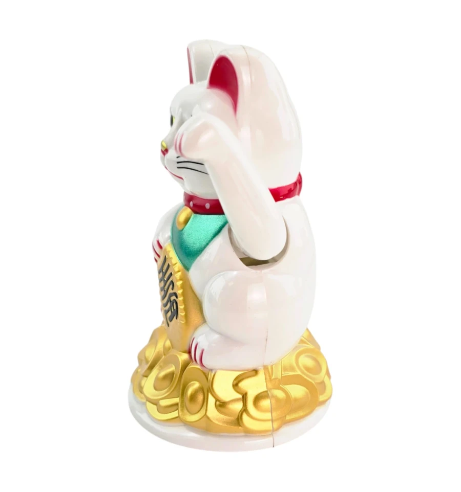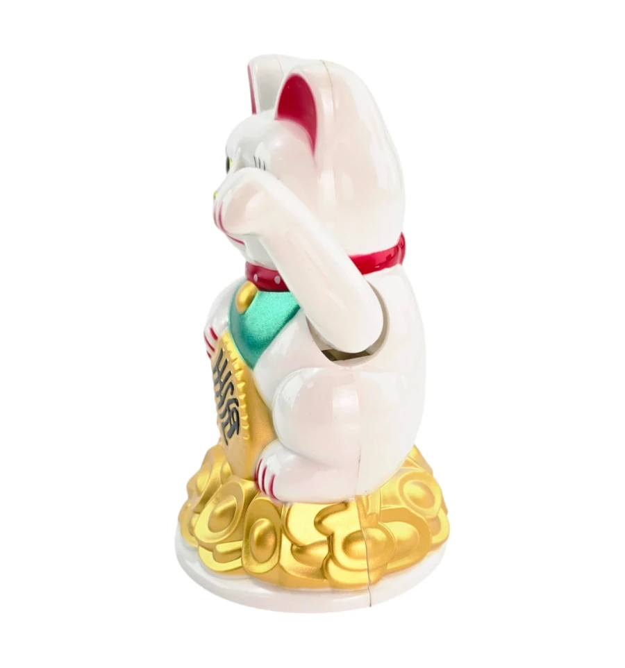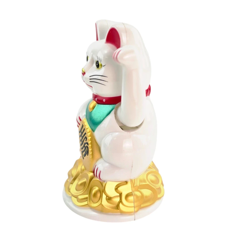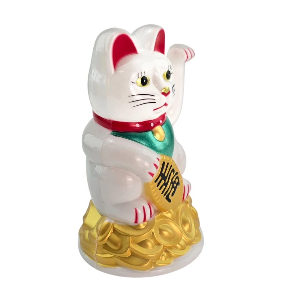 Манекі-неко - відомий «кіт удачі», талісман достатку. Фігурка піднімає лапку і ритмічно махає нею, ніби закликаючи успіх і клієнтів. У лапі кіт тримає монету кобан з ієрогліфами багатства – знак матеріального добробуту. Такий талісман ставлять біля входу, на стійці рецепції, на касі, у вітрині, в офісі або вдома (зона багатства на фен-шуй). Працює від однієї батареї AA та стане яскравим подарунком підприємцям та любителям східної символіки.