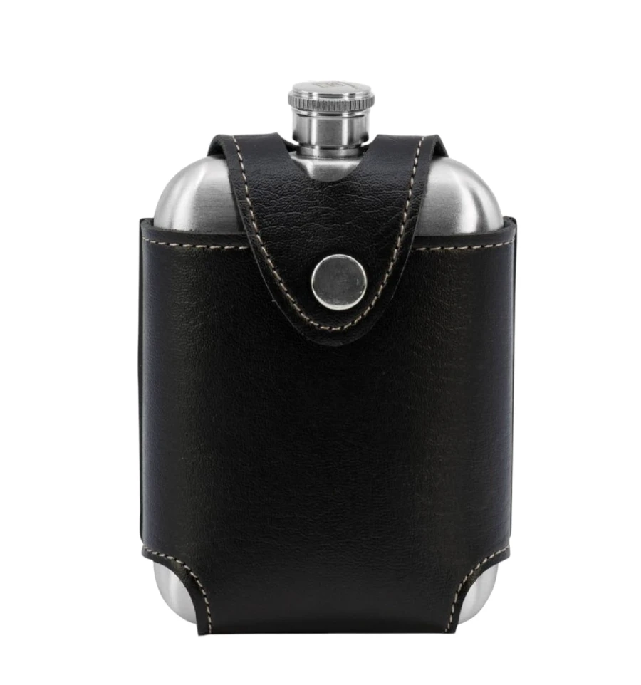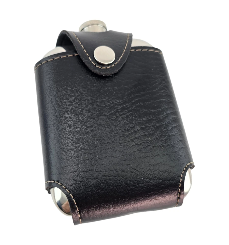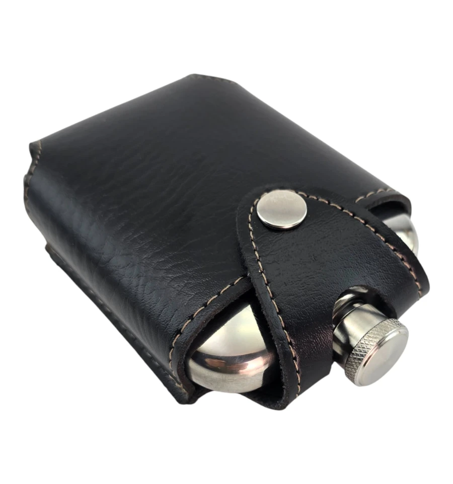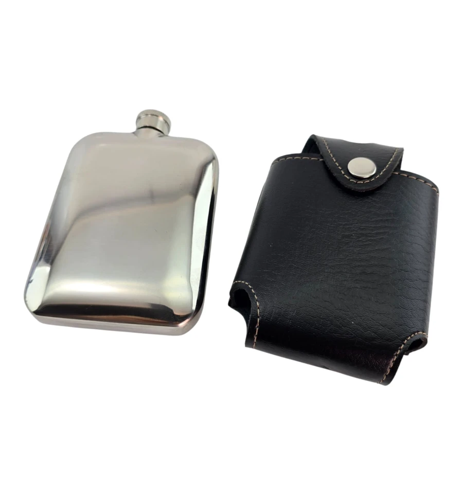 Стильна кишенькова фляга об'ємом 180 мл із гладким металевим корпусом та знімним чохлом на кнопці. Корпус із нержавіючої сталі стійкий до корозії, легкий вигин зручно лягає в руку та кишеню. Гвинтова кришка щільно закручується. Чохол з екошкіри захищає від подряпин та робить носіння зручним. Хороший варіант для поїздок, риболовлі, пікніків і як практичний подарунок.