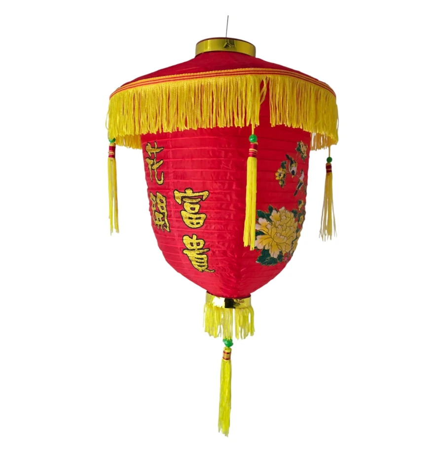 Традиційний червоний підвісний ліхтар із тканини з жовтими кистями та вишитими ієрогліфами 花開富貴 (хуа кай фугуй). Фраза означає "розпускаються квіти - приходять багатство і шана", символ процвітання, удачі та достатку. Ліхтар використовують на Китайський Новий рік, Свято ліхтарів, на весіллях, а також для оформлення ресторанів, магазинів, фотозон та домашніх терас.
