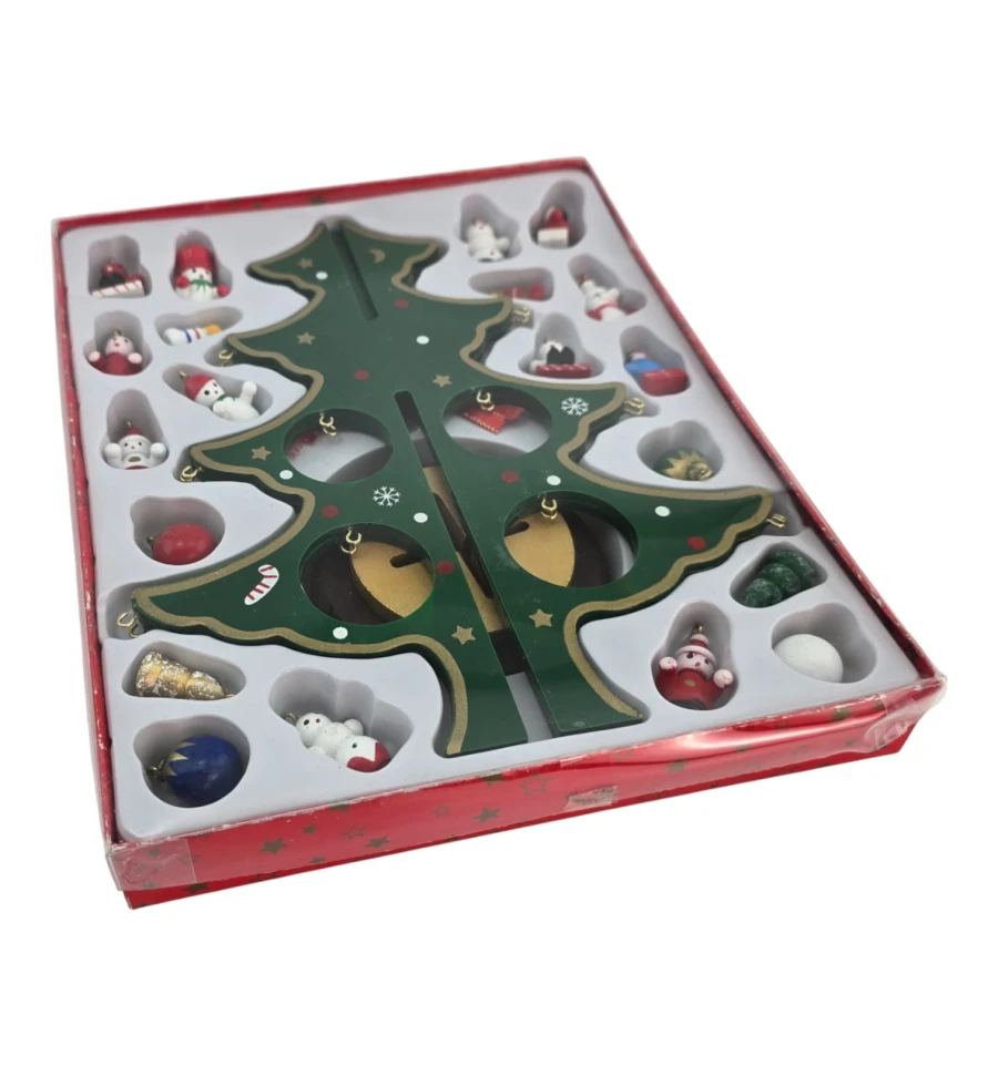 Атмосферна настільна ялинка з дерева з двостороннім розписом та набором міні-іграшок-підвісок. Складається із двох половинок, швидко збирається, стійка на круглій підставці. Металеві гачки для зручного розміщення підвісів. Компактний декор для робочого столу, каміна, підвіконня чи дитячої. Підходить для адвент-традицій – додавайте по одній іграшці щодня.