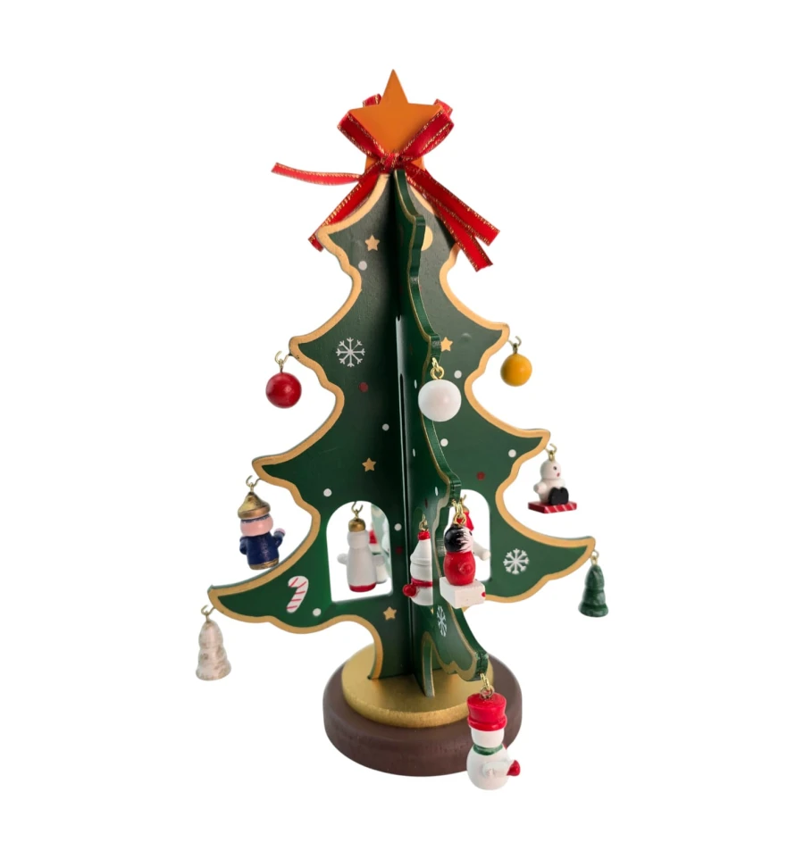 Компактна настільна ялинка з дерева з розписом та знімними міні-підвісками. Легко збирається із двох половинок, іграшки кріпляться на гачках. Підійде для робочого столу, полиці, стійки ресепшн чи дитячої – створює святковий настрій навіть у невеликому просторі. У комплекті стрічка-бантик на маківку.