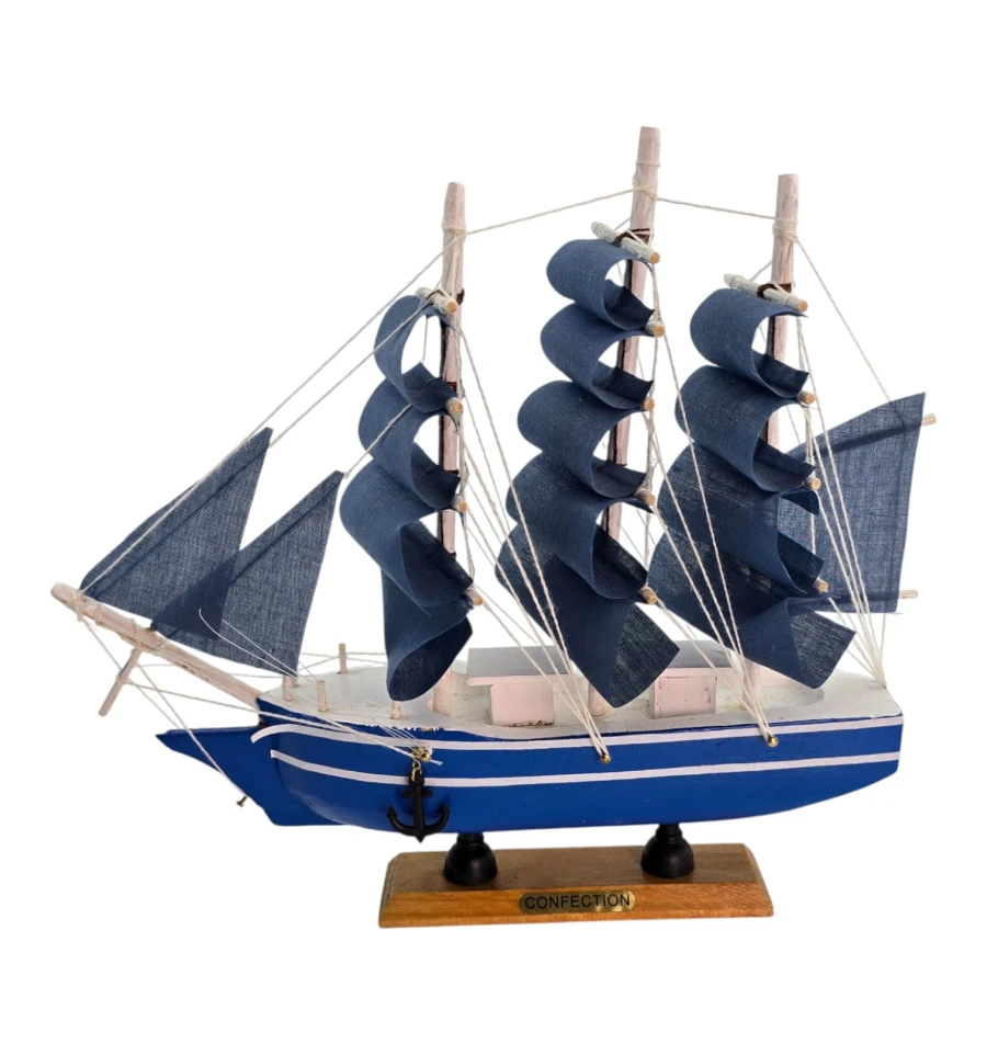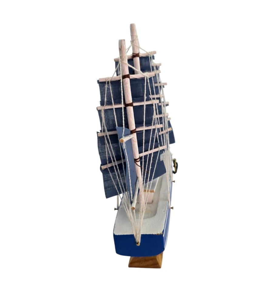 Настільна модель парусного корабля у синьо-білій гамі. Дерев'яний корпус та щогли, тканинні вітрила та шнуровий такелаж створюють виразний морський акцент для полиці, каміна чи робочого столу. Відмінний подарунок любителям морської тематики та стильний елемент інтер'єру.