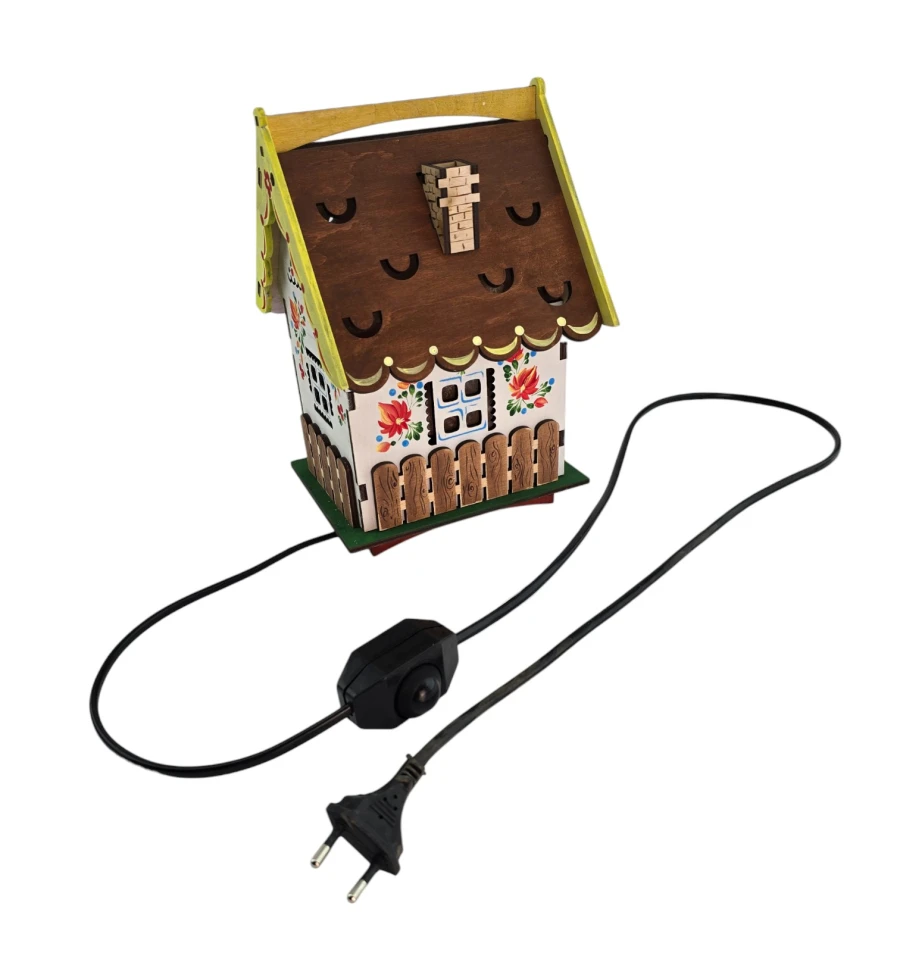 · Дизайн "Будиночок": Світильник виконаний у вигляді затишного будиночка з натурального дерева. Дерев'яний корпус прикрашений ажурним різьбленням та яскравим ручним розписом у народному стилі (квіткові мотиви, паркан), що надає йому теплоти та казкового вигляду. Дах, що відкривається, дозволяє милуватися кристалами солі.