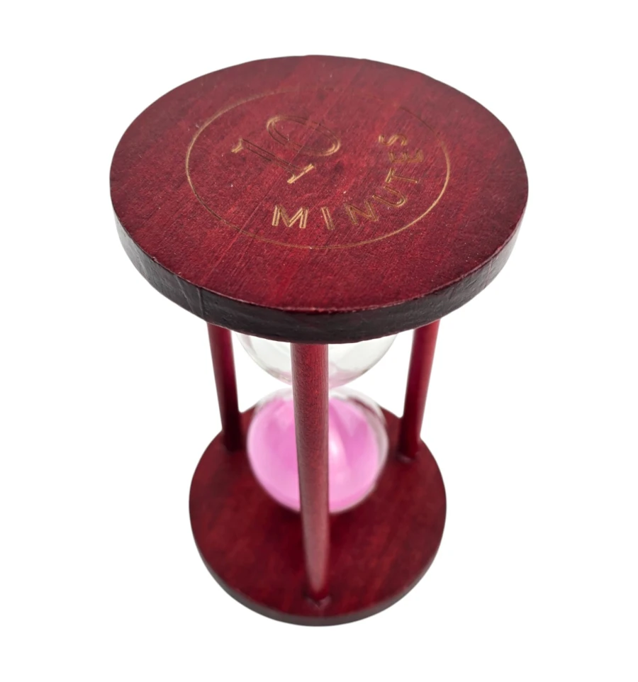 Компактний пісочний таймер на 10 хвилин у дерев'яному корпусі із прозорою скляною колбою. Підходить для медитації, чаювання, настільних ігор, навчання та методу Pomodoro. Стійка кругла підставка фіксує годинник на столі.