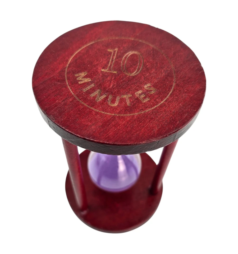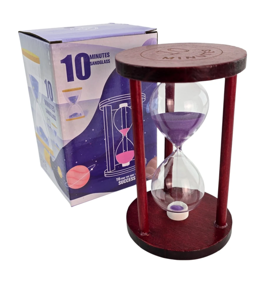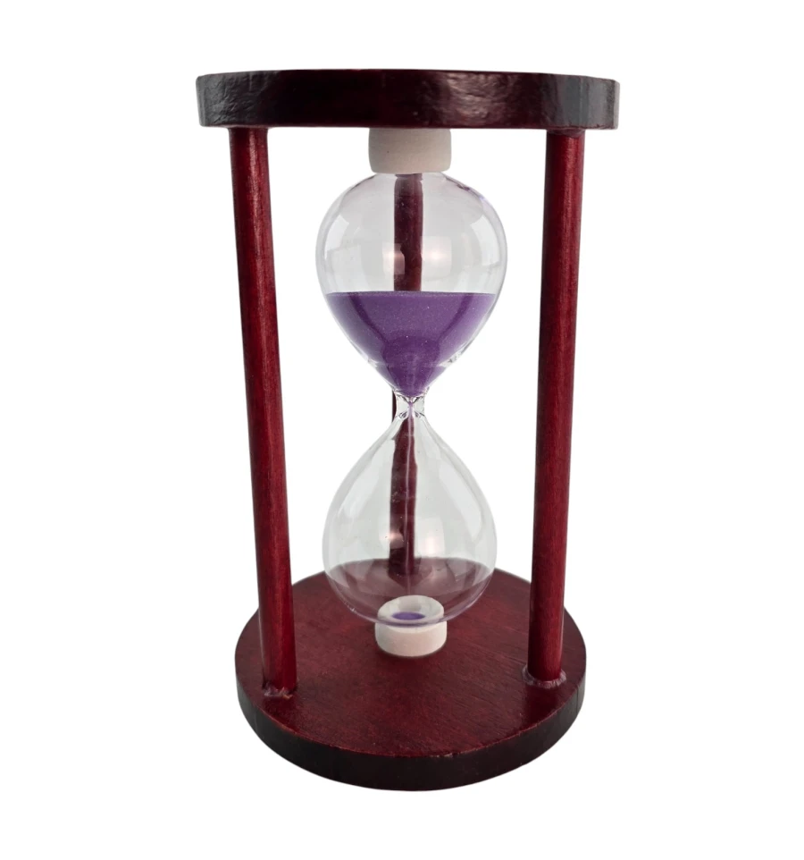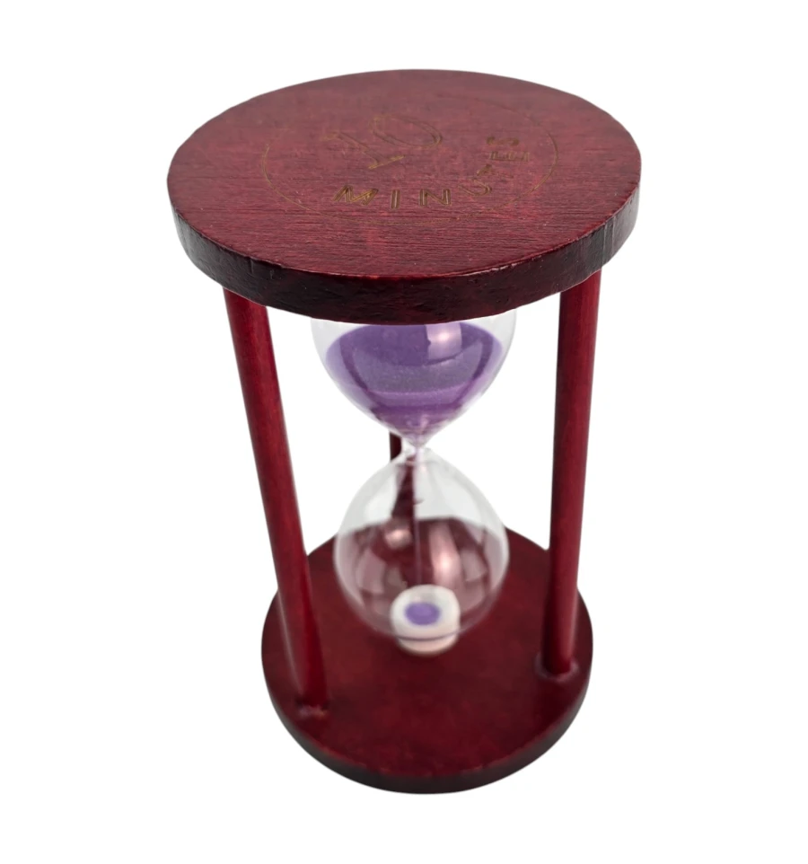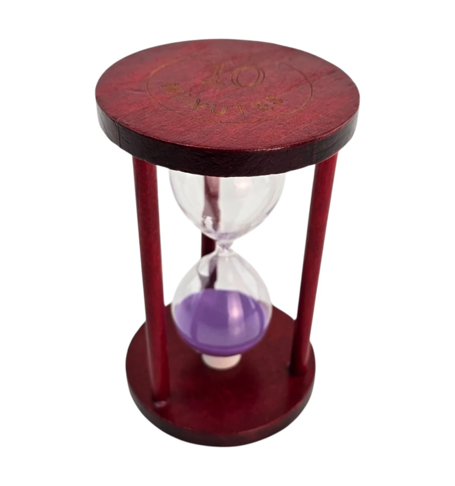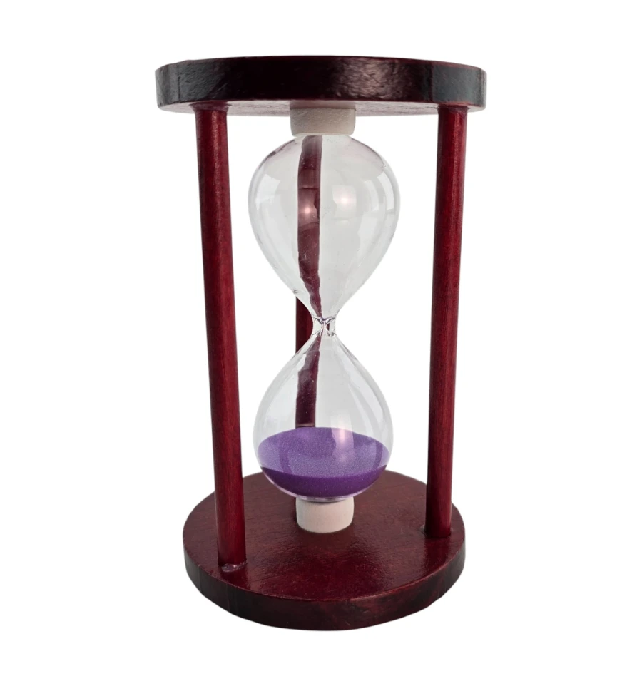 Стильний пісочний годинник з дерев'яною рамою та скляною колбою. Прямий хід піску допомагає відраховувати 10-хвилинні інтервали для медитації, навчання, кухні або робочих перерв. Фіолетовий пісок створює виразний акцент в інтер'єрі будинку та офісу.