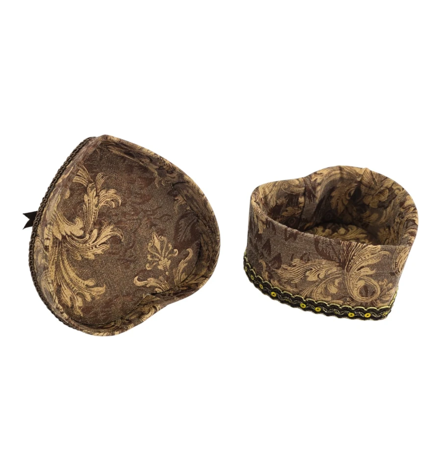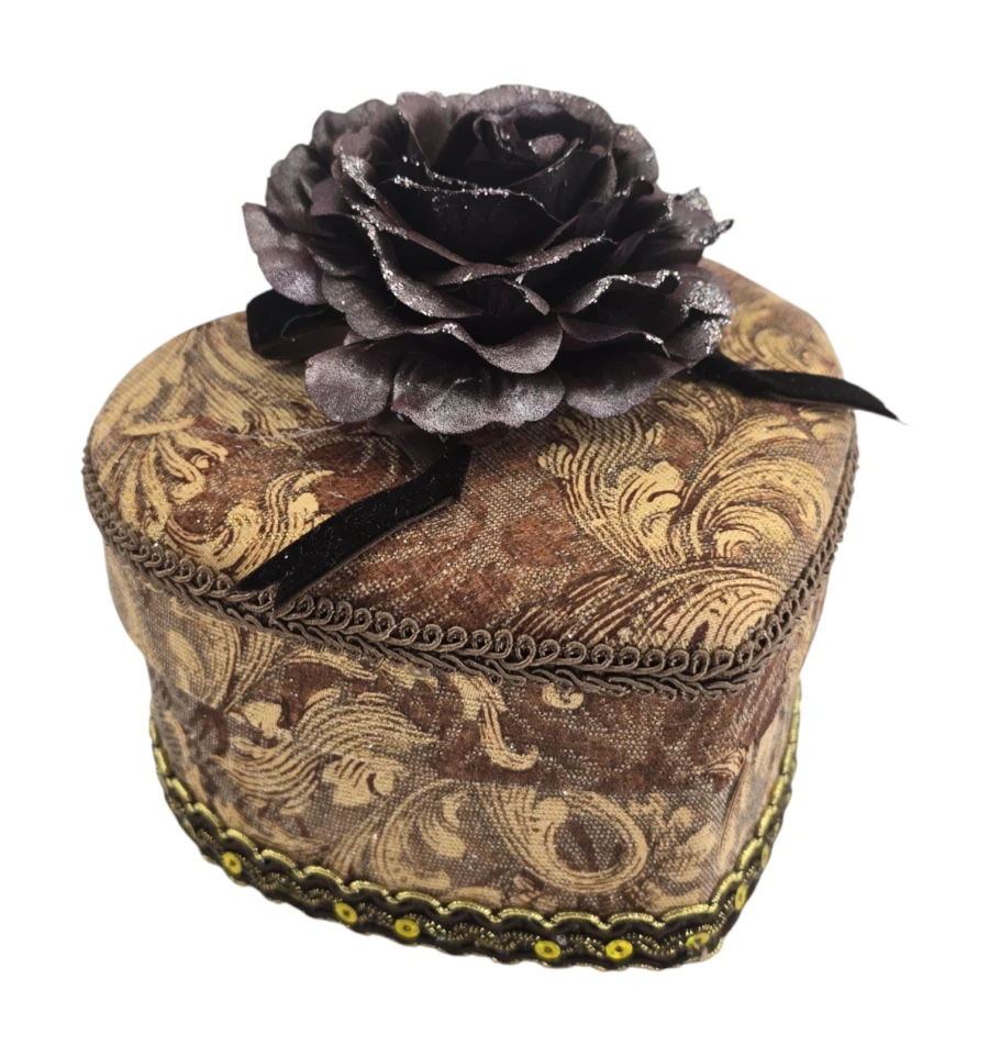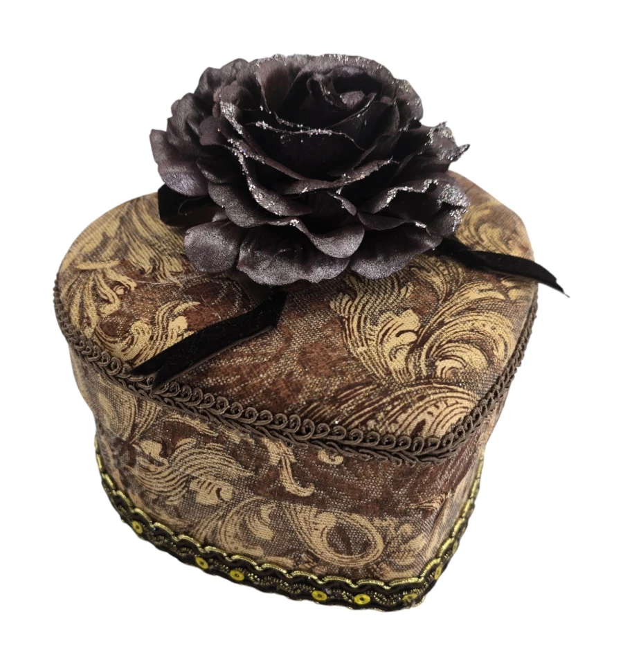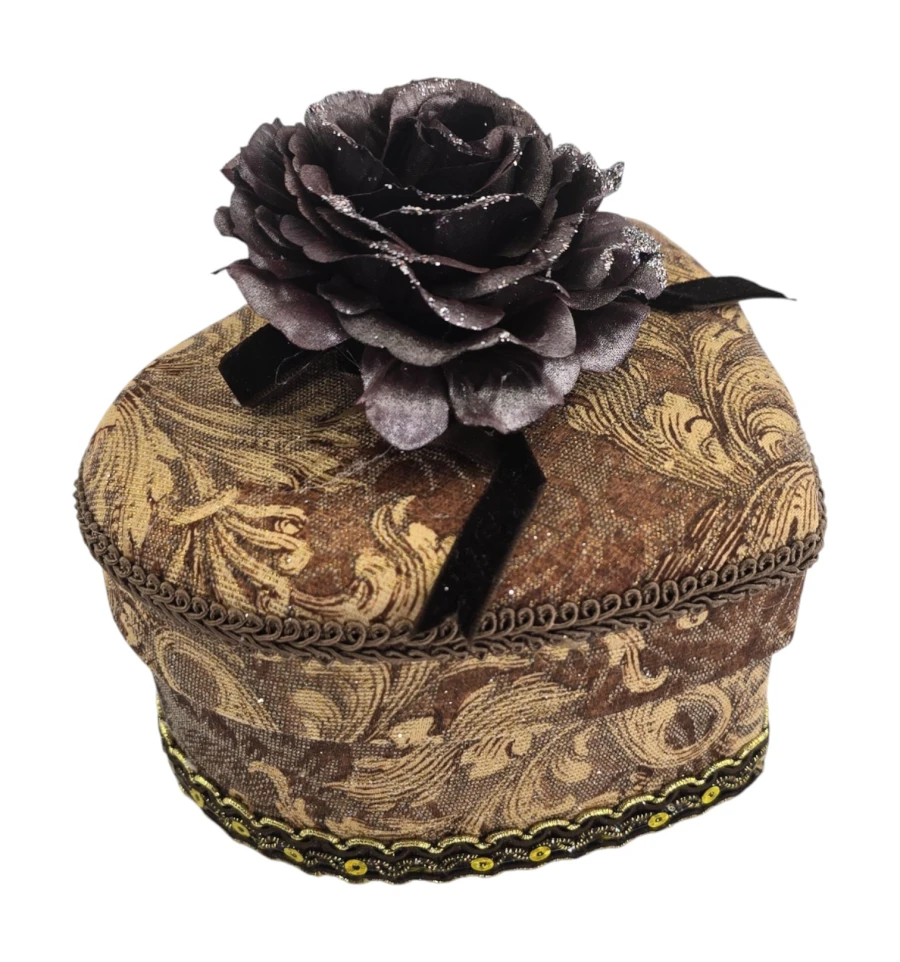 Декоративна скринька для прикрас та пам'ятних дрібниць. Корпус обтягнутий тканиною з орнаментом у теплих коричневих тонах, кришка знімна та прикрашена об'ємною квіткою та тасьмою. Підходить як скринька для біжутерії або подарункова коробочка. Внутрішня глибина 6 см. Можливі невеликі розходження декору.