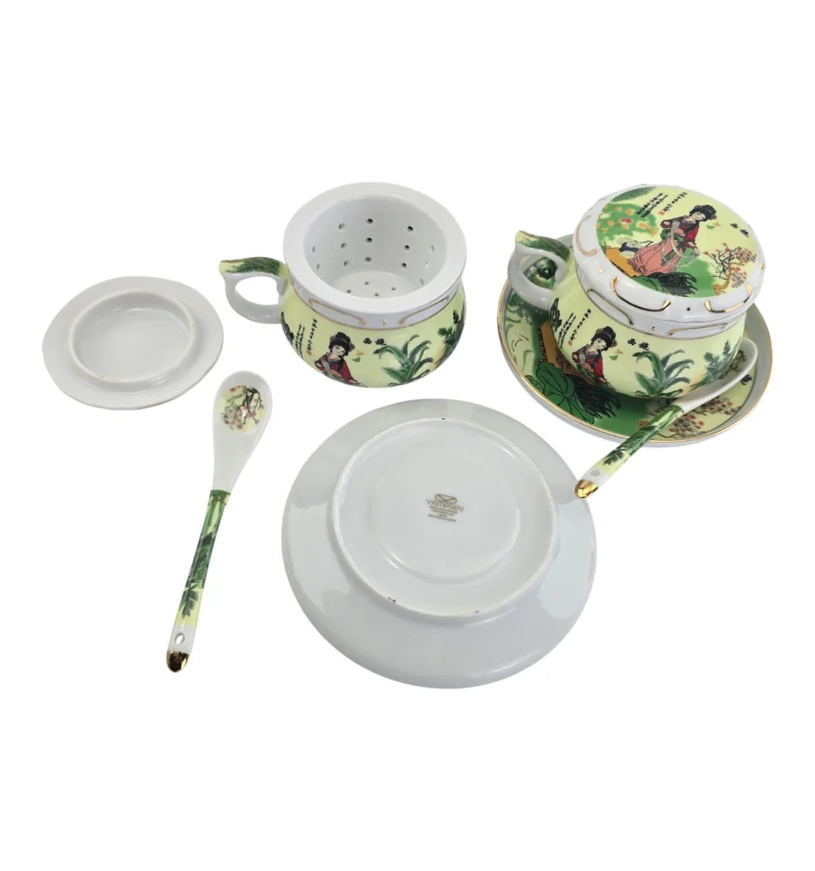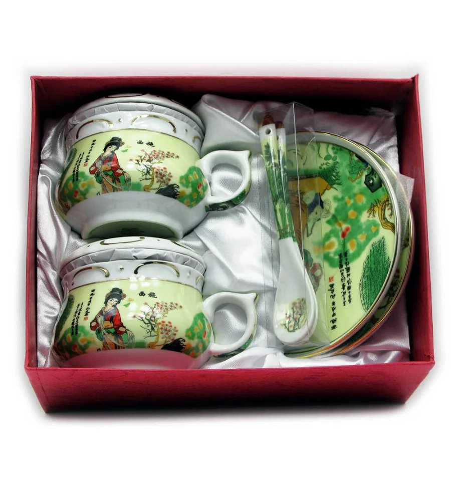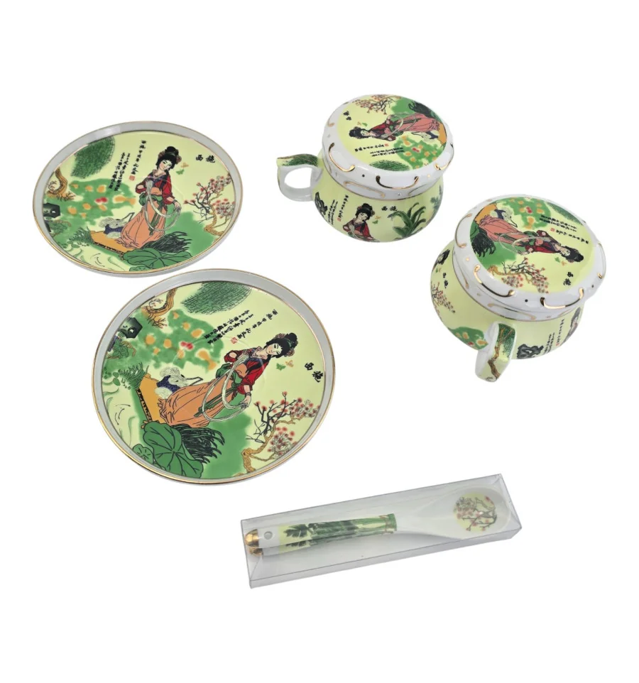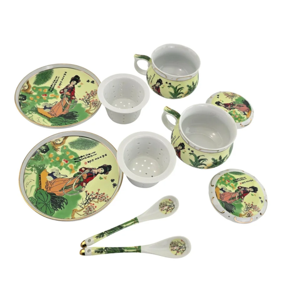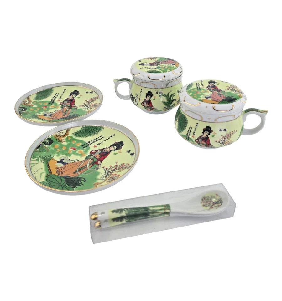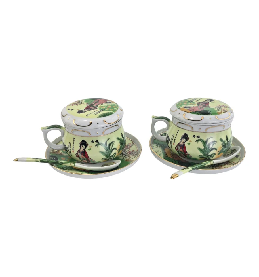 Сервіз фарфор (190мл.) (2GBC-A77SP) 2 чашки + 2 блюдця + 2 ложки "Дівчина на салатному тлі" (h-6см., d-7см.)