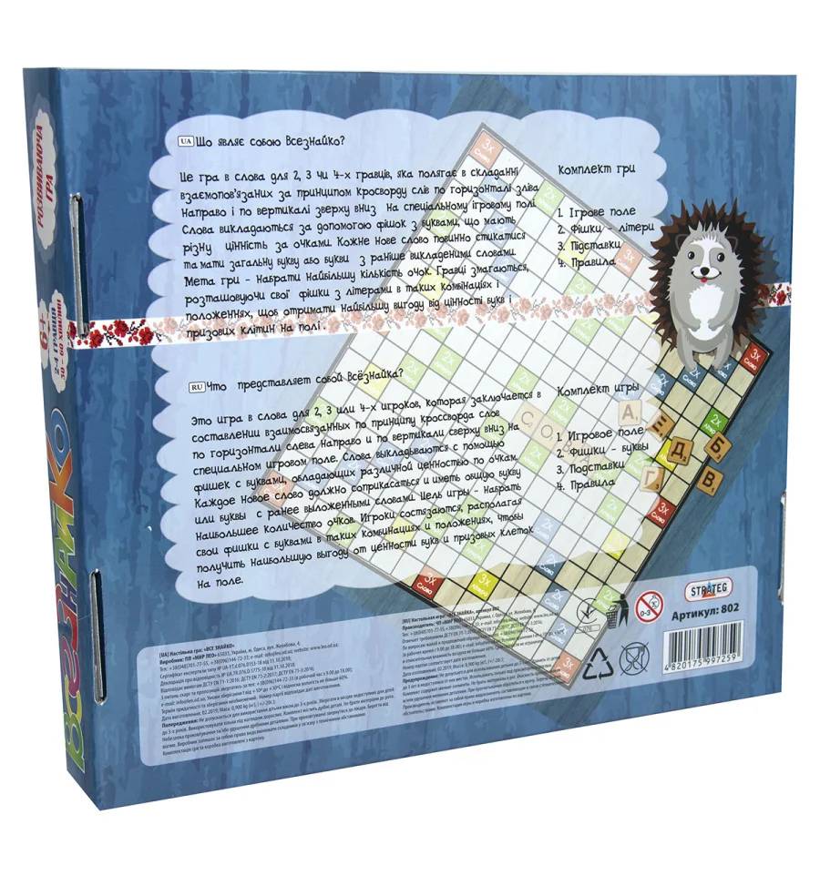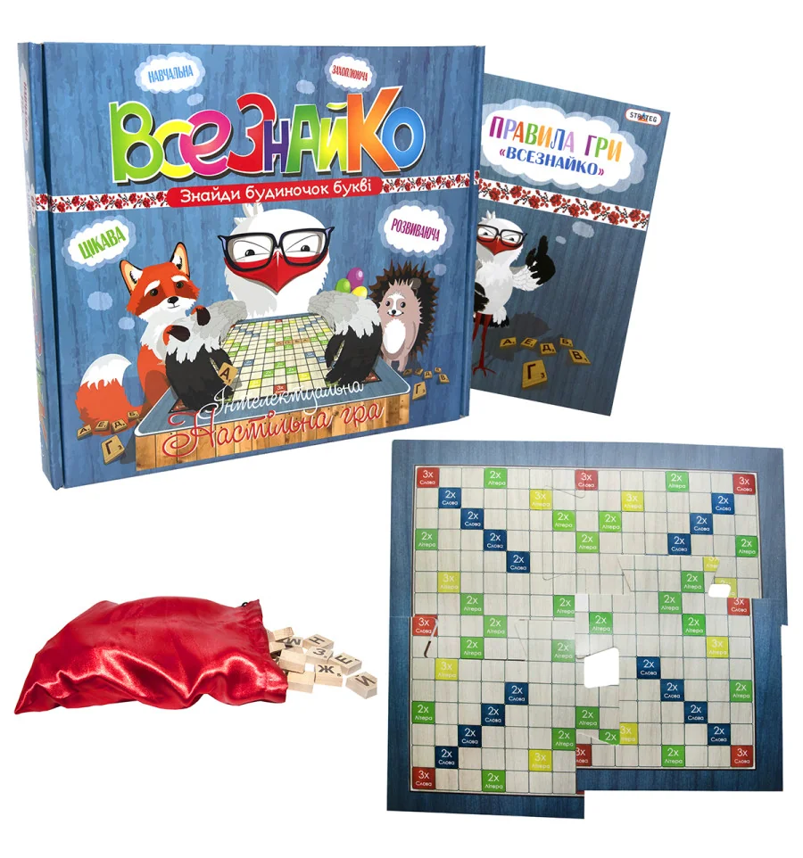 Набір включає ігрове поле з високоякісного щільного картону у вигляді пазлу з 4 частин, дерев’яних фішок з літерами в сумці та інструкція з детальними правилами гри. Суть гри полягає в тому, щоб скласти слова з центру ігрового поля горизонтально або вертикально. Слова повинні перетинатися за принципом кросвордів, тобто мати мінімум одну або кілька спільних букв. За складені слова гравцям присуджуються бали. Крім того, кожна фішка з буквою має певне значення. Це також потрібно враховувати, щоб набрати максимальну кількість балів.