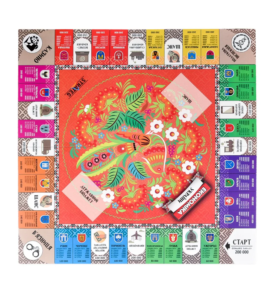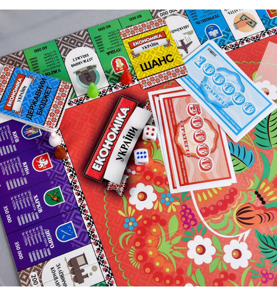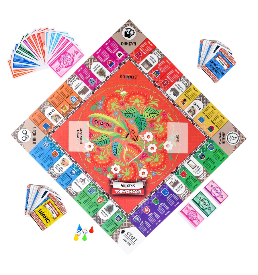 Комплектація | фішки для гравців, фішки для власності, картки, банкноти, ігрове поле, кубики, правила гри |