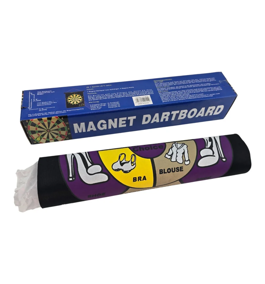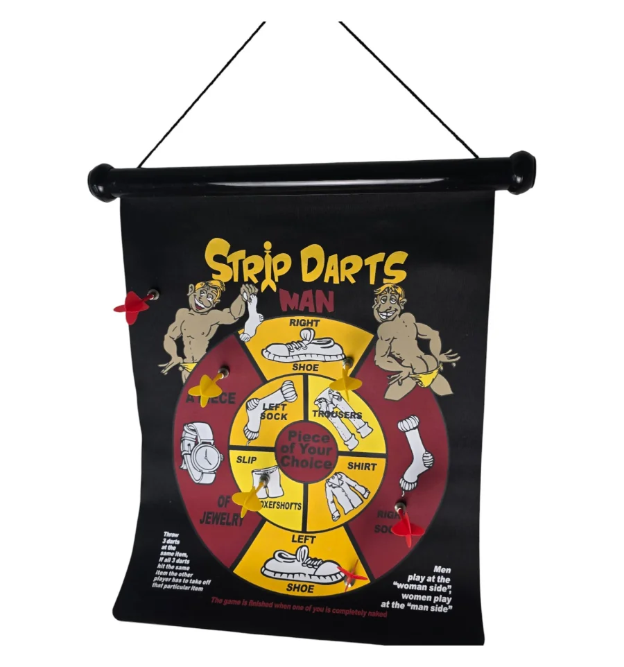 Двосторонній магнітний дартс "Strip Darts" - жартівлива гра для дорослої компанії. На одній стороні мішені правила для чоловіка, на іншій – для жінки, а поле поділено на сектори з елементами одягу та невеликими завданнями. Магнітні дротики надійно прилипають до полотна, не дряпають стіни і безпечніше за класичний дартс з голками.