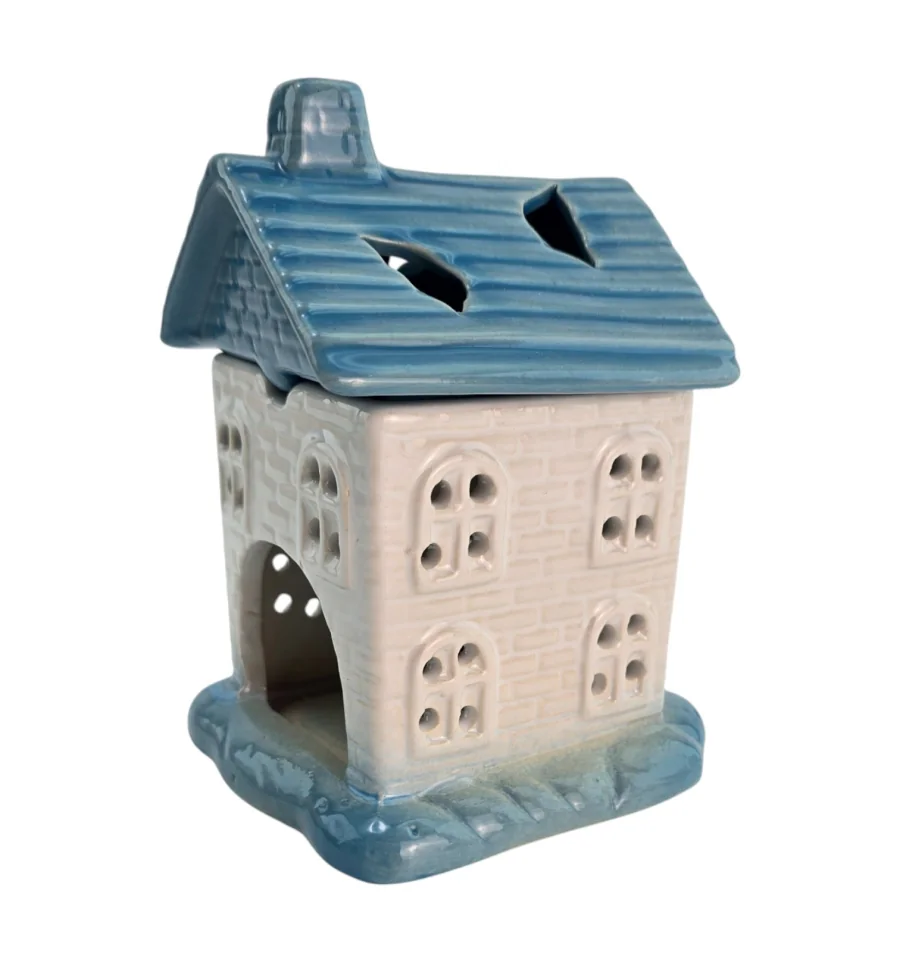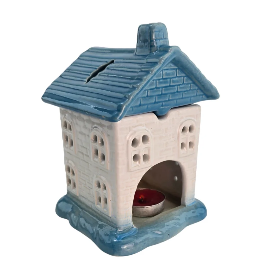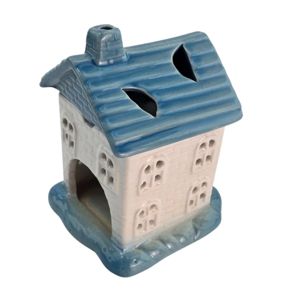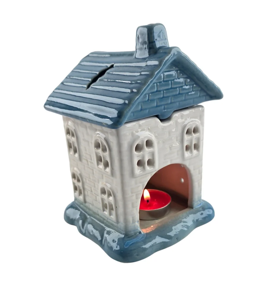 Керамічна аромалампа у вигляді невеликого будиночка з білими стінами та блакитним дахом. Внизу всередині ставиться чайна свічка, а зверху, під дахом, що знімається, знаходиться чаша для води з ароматичним маслом або воском. При свічці, що горить, світло красиво виходить через вікна і прорізи в даху, створюючи м'яке затишне освітлення.