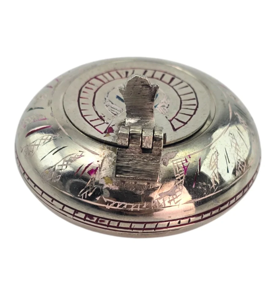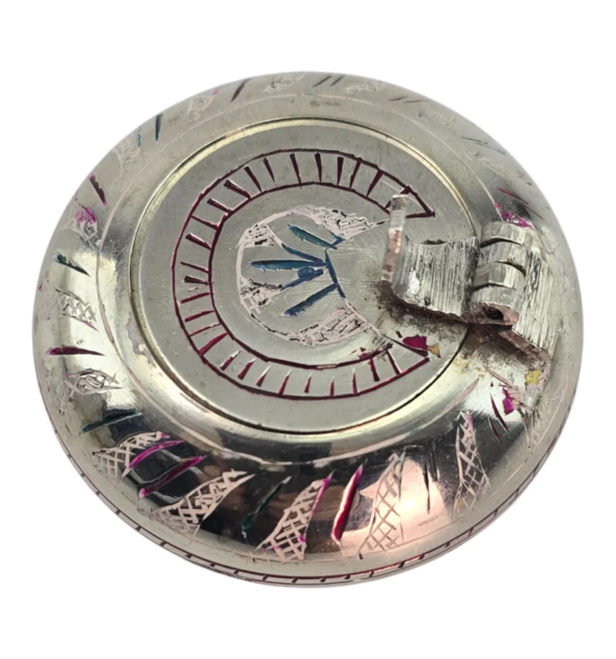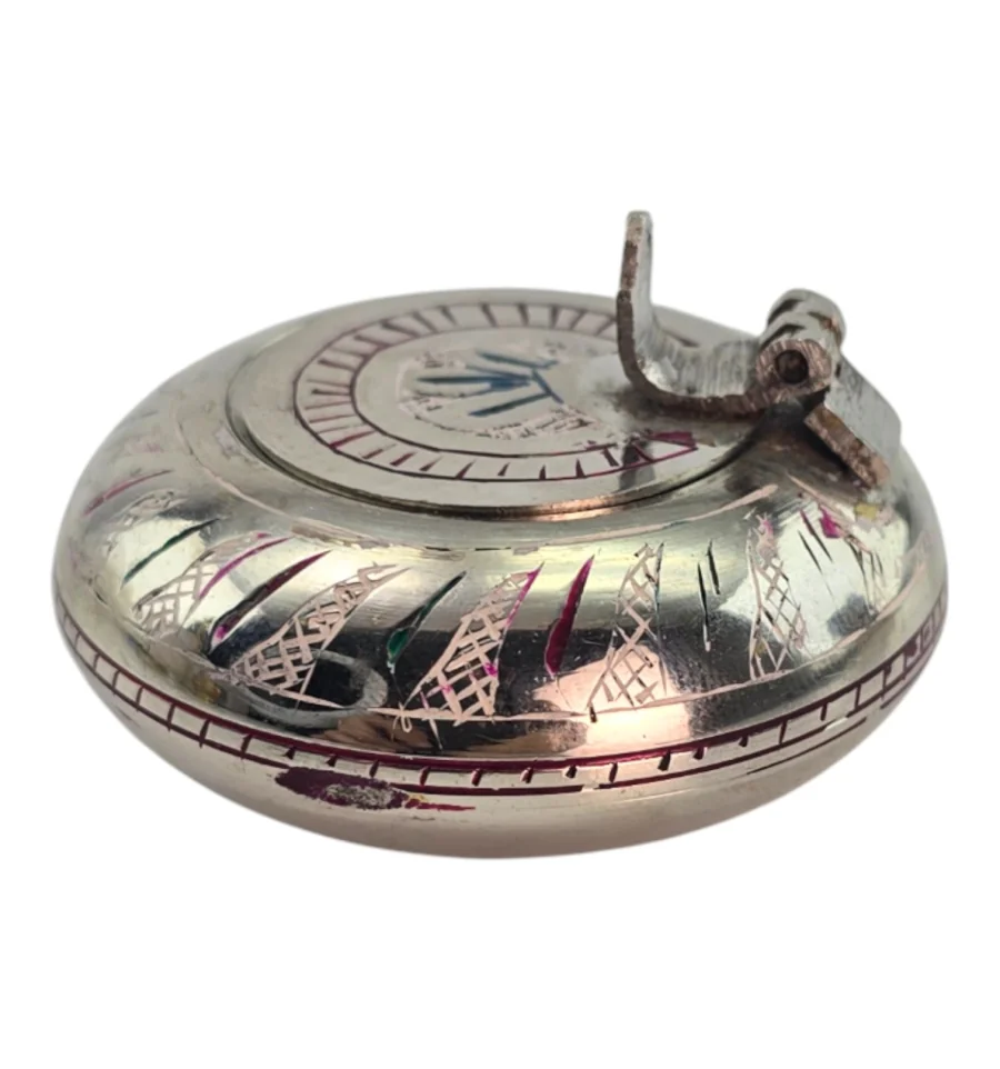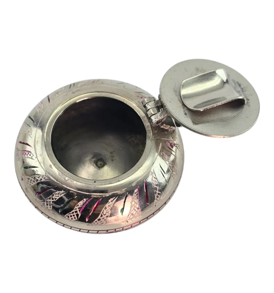 Невелика кругла попільничка з Індії у сріблястому кольорі з акуратним кольоровим гравіюванням. Зручна кришка з виїмкою для сигарети дозволяє покласти її зверху і прикрити попіл, щоб дим і запах менше поширювалися по кімнаті. Внутрішня чаша досить глибока для попелу та недопалків, гладкі краї легко очищаються. Підходить як настільна попільничка для дому, офісу або як невеликий подарунок любителю тютюнових аксесуарів. Свічка на фото не входить у комплект.