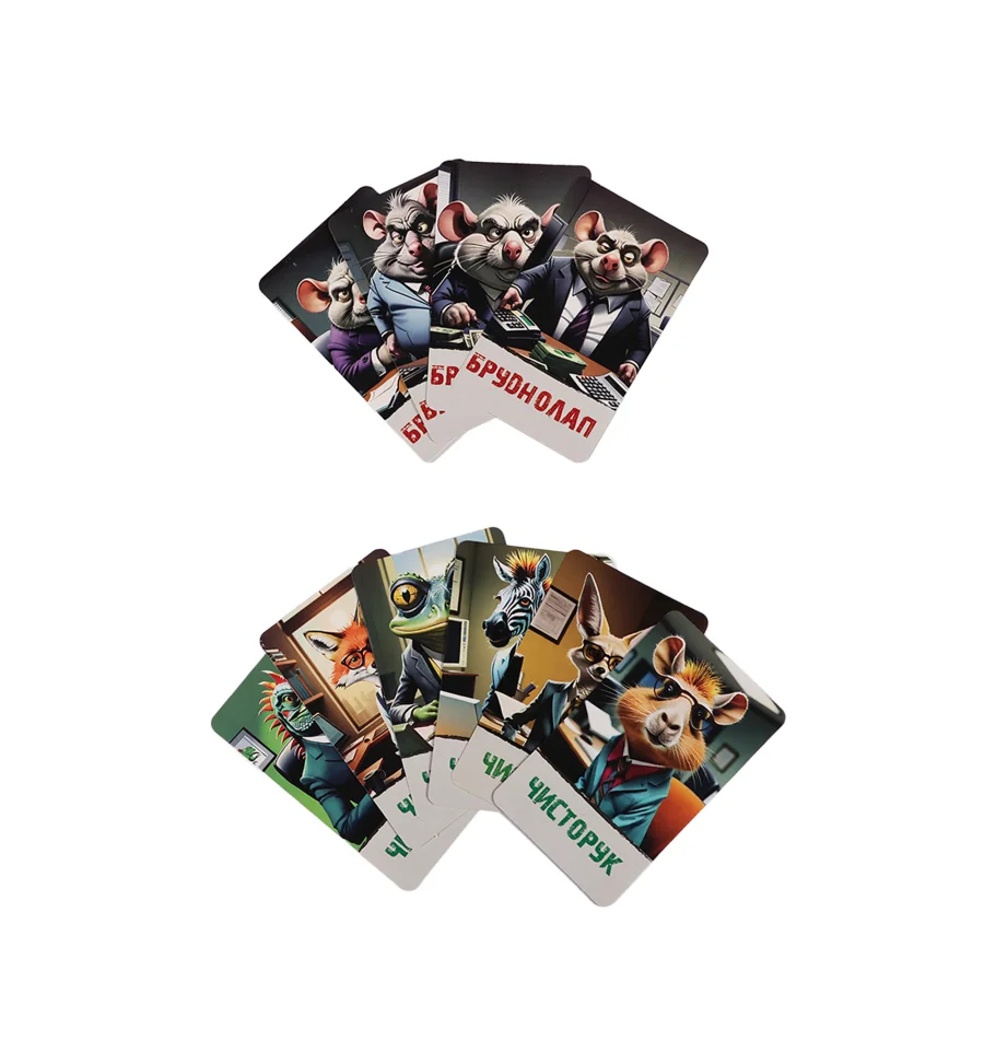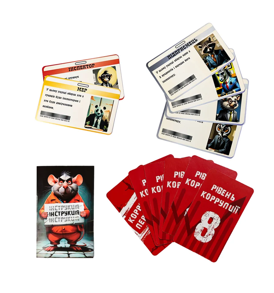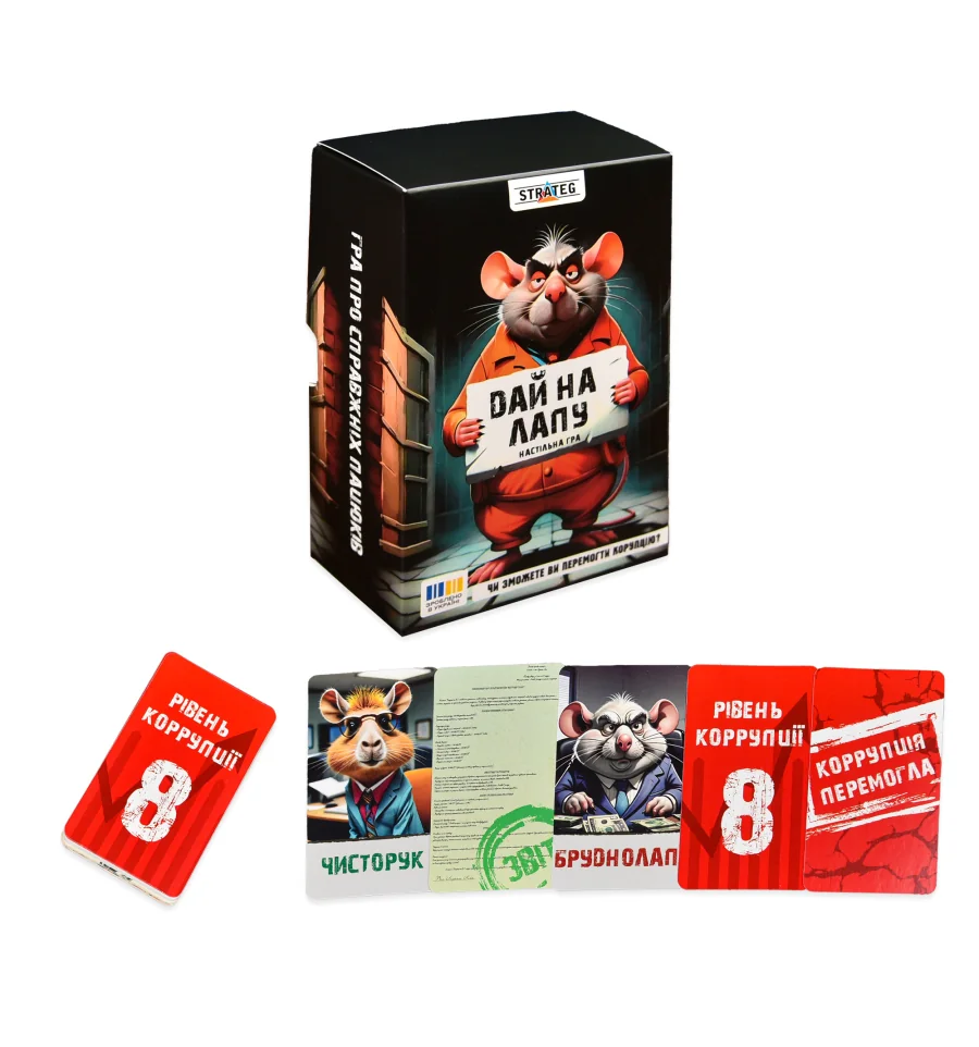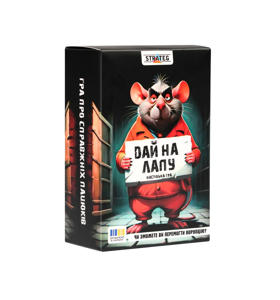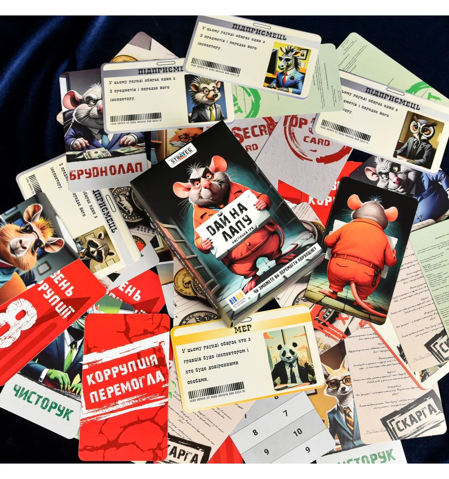 Настільна гра «Дай на лапу», 30970«Дай на лапу» — настільна гра з таємними ролями, блефом і прихованими мотивами для компанії друзів.У грі гравці стають мешканцями міста Тваринвіль, де частина з них — «Чисторуки», а частина — «Бруднолапи». «Чисторуки» намагаються стримати корупцію та очистити місто від «Бруднолапів», тоді як «Бруднолапи» діють приховано, дають хабарі і поступово підвищують рівень корупції.Протягом гри доведеться блефувати, домовлятися, маніпулювати інформацією та уважно стежити за іншими, адже ніхто не знає, кому можна довіряти.