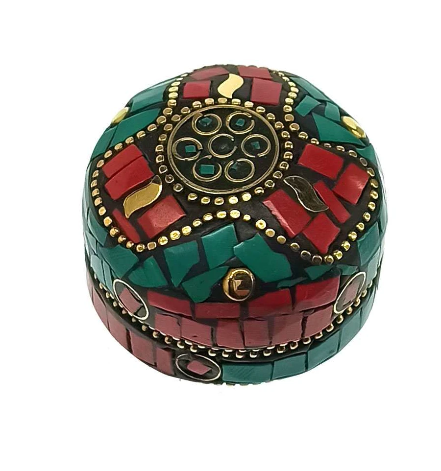 Шкатулка металическая с кораллами и бирюзой (d-4.5 см h-2 см)