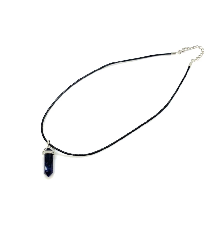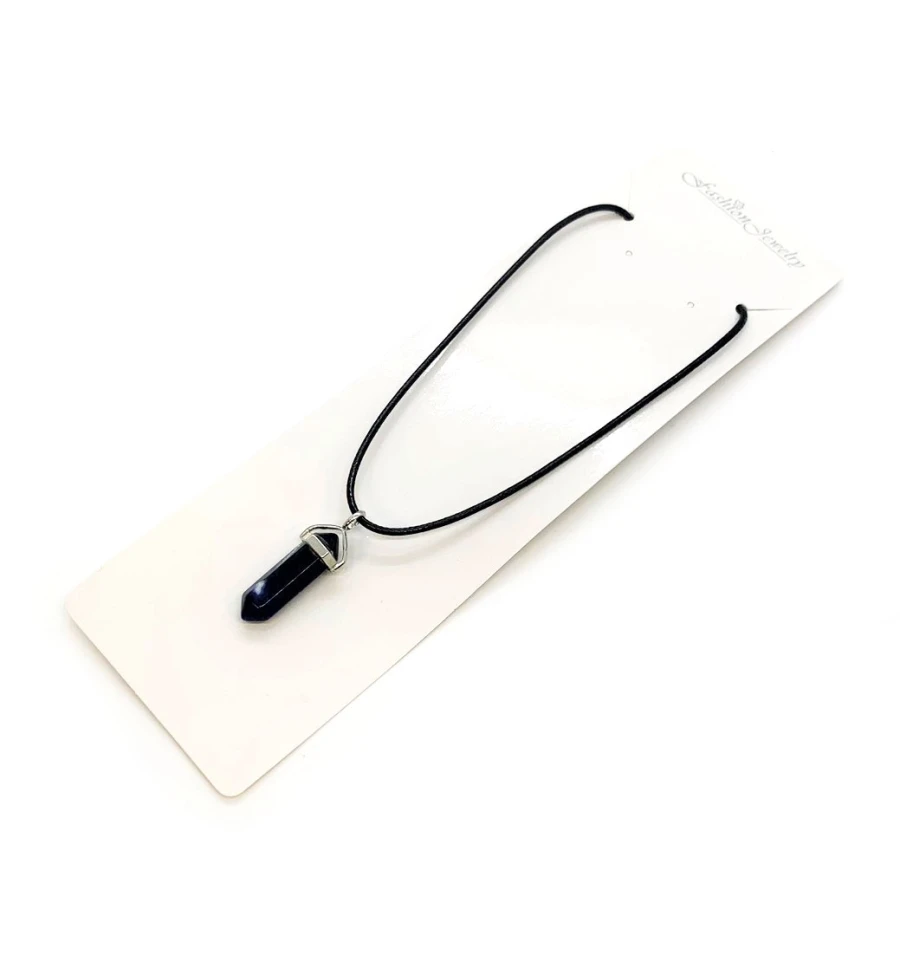 Ця підвіска на шию має чорний шнурок та кулон із каменю темно-синього кольору у формі шестикутника. Кулон виконаний з каменю, розмір, 3 см завдовжки і 1х0.8 см завширшки. Кристал темно-синього кольору виглядає елегантно та вишукано на чорному шнурку. Шнурок має карабінний замок, що забезпечує надійне кріплення кулона на шию. Кулон у формі шестикутника надає цій підвісці на шию сучасний та стильний вигляд, роблячи її чудовою прикрасою. Підвіска на шию підійде для повсякденного використання або для особливих заходів і стане чудовим подарунком для будь-якої жінки, яка цінує красу та стиль.