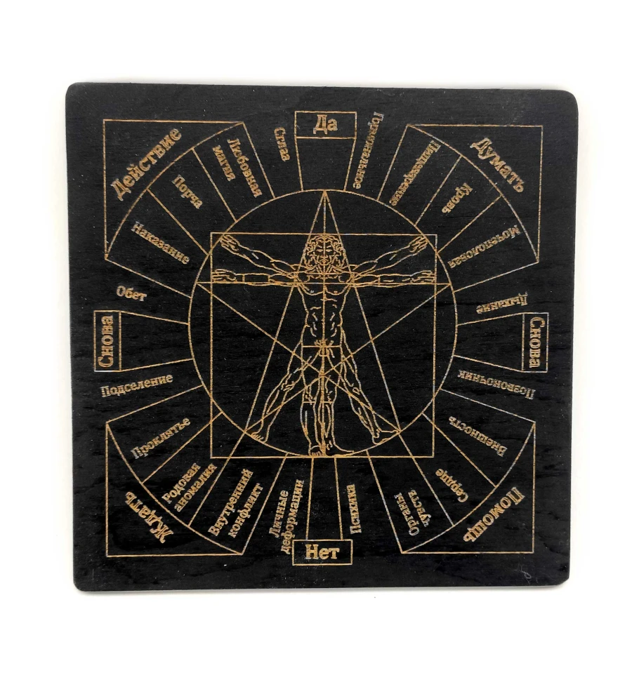 Таблиця "Магічні впливу" є потужним інструментом для роботи з маятником і проведення магічних ритуалів. Ця таблиця виконана з якісного дерева і має розмір 18х18х0,4 см. Вона темна та покрита емаллю, що надає їй додаткової міцності та естетичного вигляду. На поверхні таблиці виконано гравіювання з різними символами та рунами, які використовуються в магічних ритуалах та впливах. Таблиця допоможе вам визначити найкращий спосіб проведення магічних дій та прийняти рішення у важких ситуаціях. Вона також може бути використана для магічних ритуалів, спрямованих на вирішення різних життєвих проблем. Ця таблиця є чудовим вибором для тих, хто займається магією і хоче покращити свої результати у цій галузі.