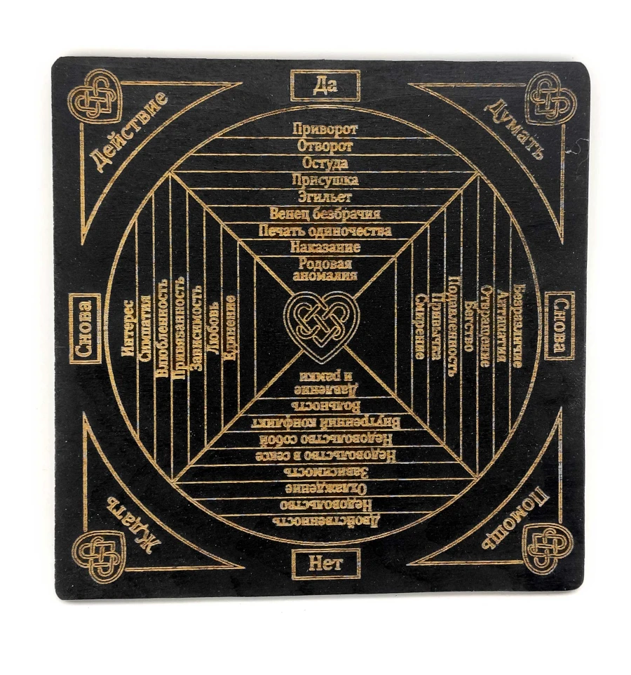 Таблиця любовної магії - це потужний інструмент для тих, хто шукає кохання, стабільні стосунки та щасливий шлюб. Ця таблиця виконана з якісного дерева і має розмір 18х18х0,4 см. Вона темна та покрита емаллю, що надає їй додаткової міцності та естетичного вигляду. На поверхні таблиці виконано гравіювання з різними символами та рунами, що використовуються у любовній магії. Вона може використовуватися для різних магічних цілей, наприклад, залучення нових любовних відносин, зміцнення існуючих відносин, а також для вирішення конфліктів та зменшення негативної енергії у відносинах. Ця таблиця є відмінним вибором для тих, хто хоче покращити свої стосунки та залучити любов до свого життя.