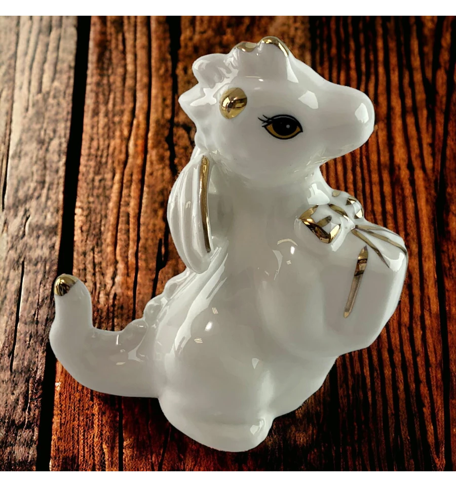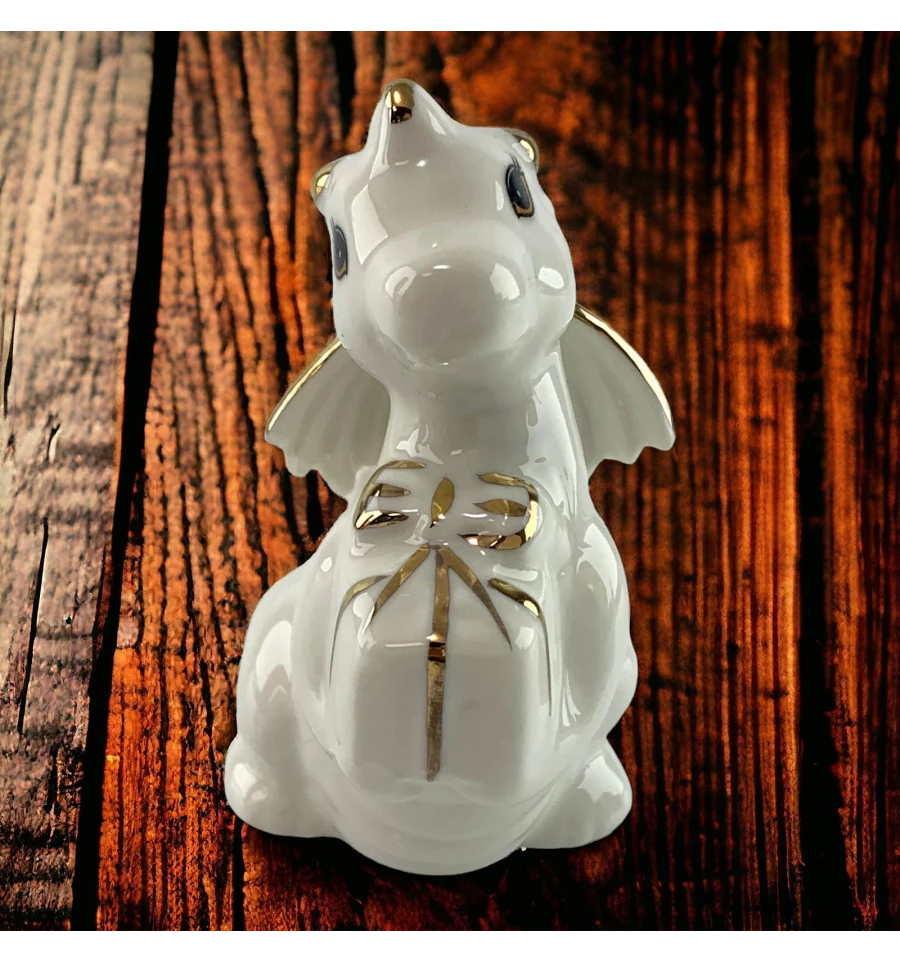 Порцеляновий дракон у білому кольорі із золотистими деталями – це не тільки витвір мистецтва, а й символ вишуканості та доброзичливості. Дракон делікатно обіймає коробку подарунка, ніби надаючи вам її з повагою і турботою.