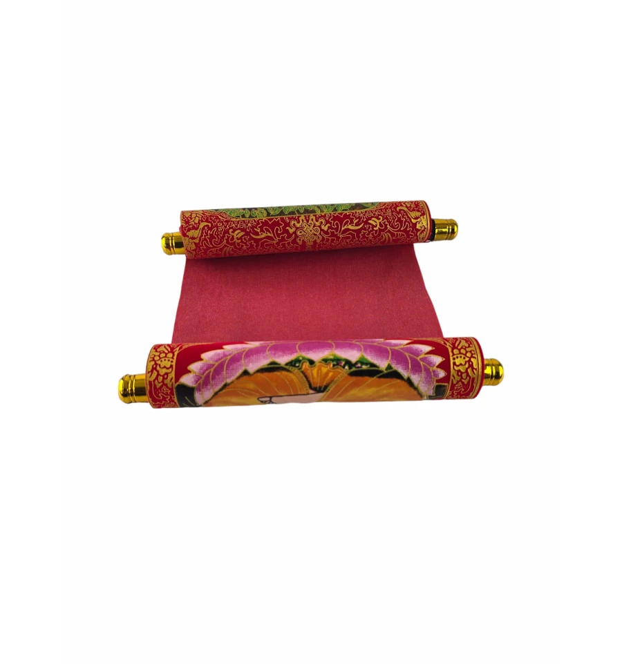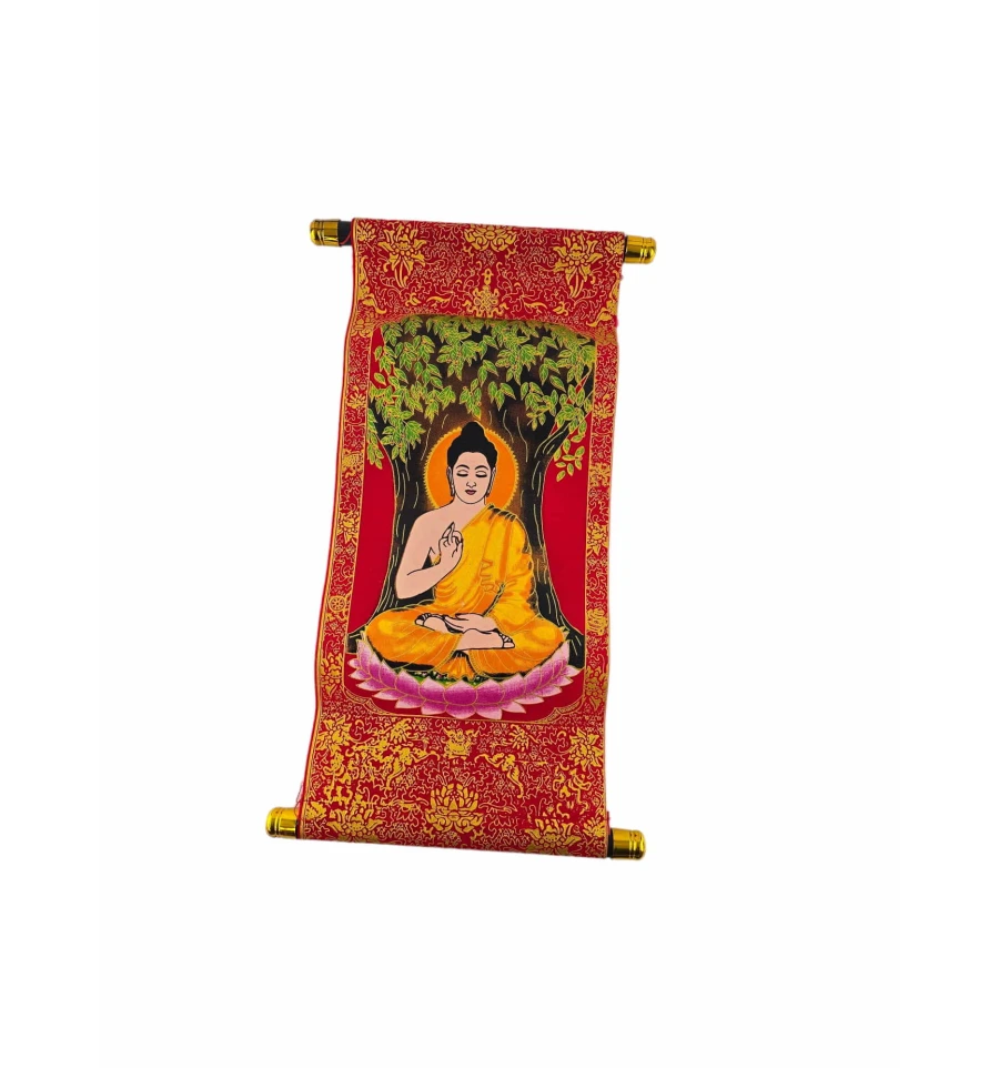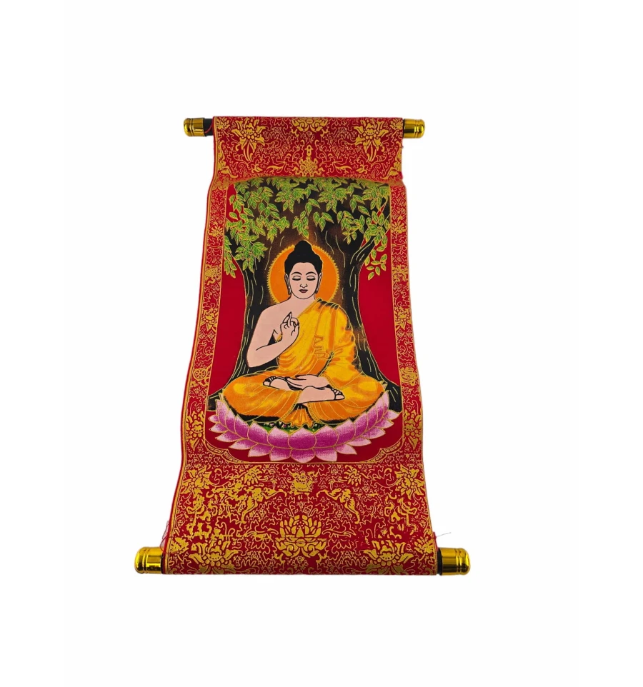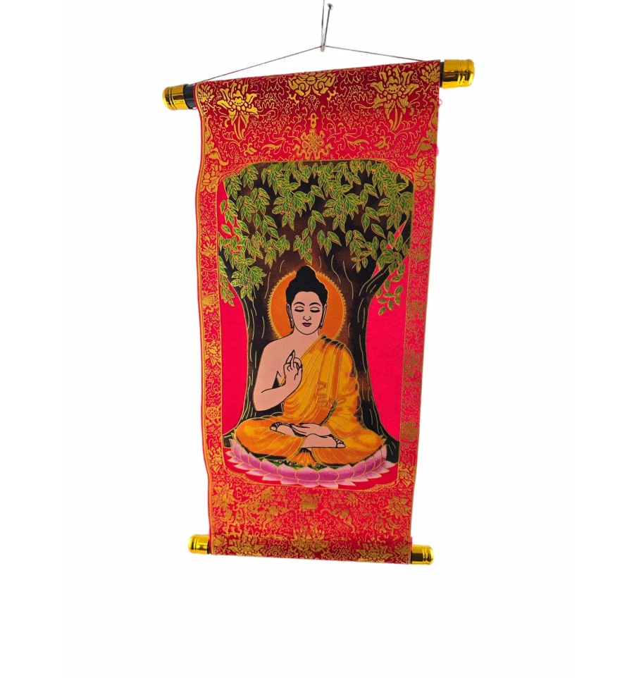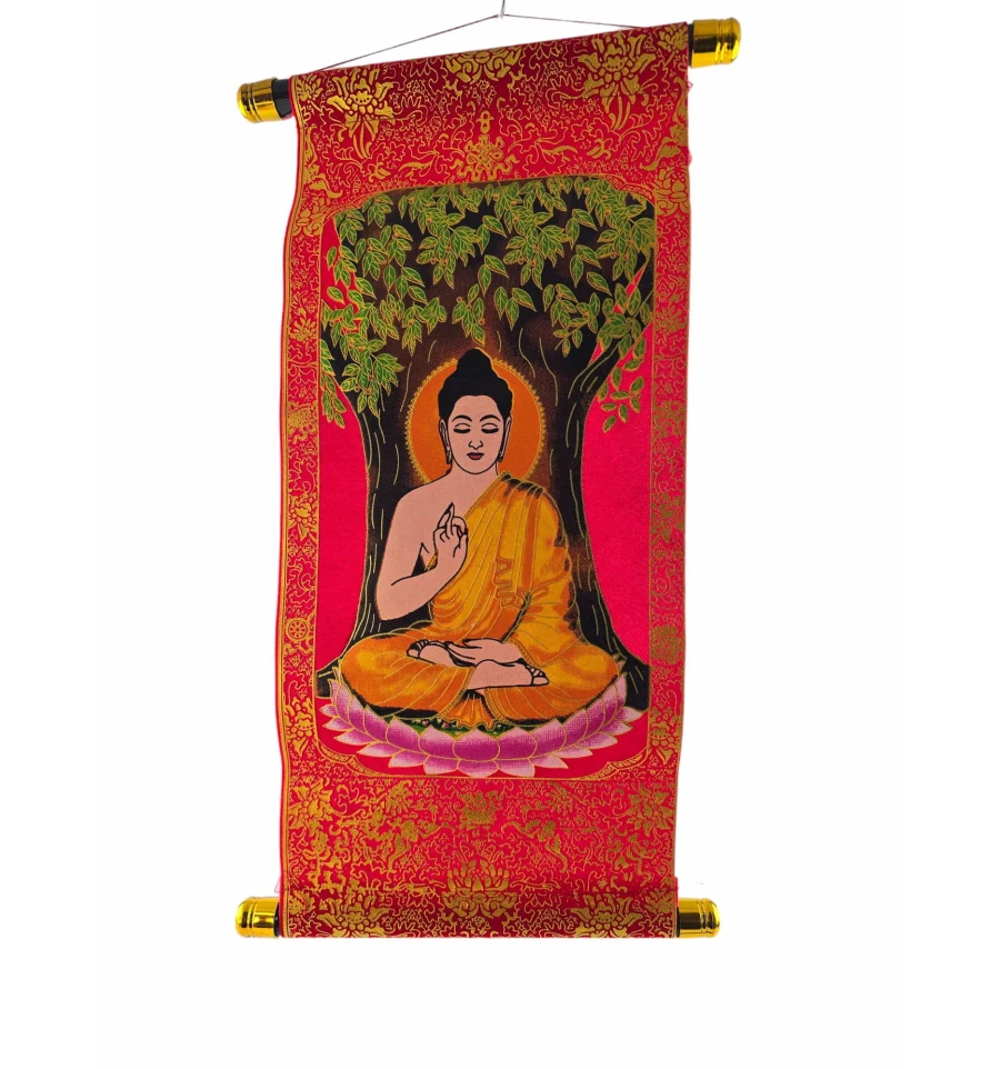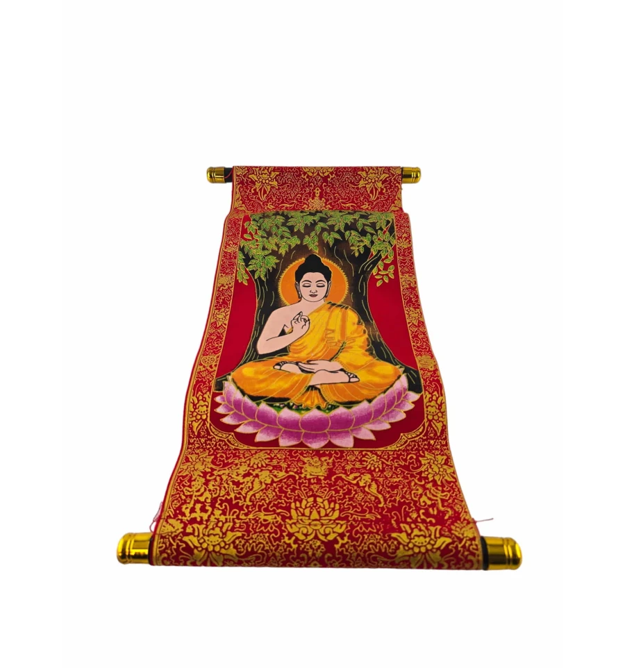 Панно "Будда медитації" в червоному кольорі із золотистим оздобленням - це вишукана та духовно насичена декоративна прикраса для вашого інтер'єру. Виготовлене з тканини, воно надається у формі сувої, що надає йому атмосфери автентичності та витонченості.