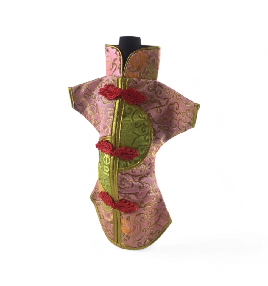 Цей елегантний чохол на пляшку виконаний у традиційному східному стилі та нагадує мініатюрне кімоно. Він виготовлений із міцної тканини з яскравим орнаментом, що включає символи та зображення, типові для східної культури.