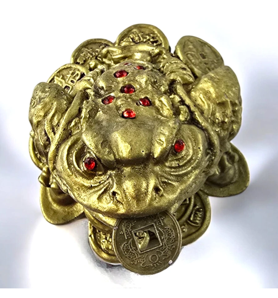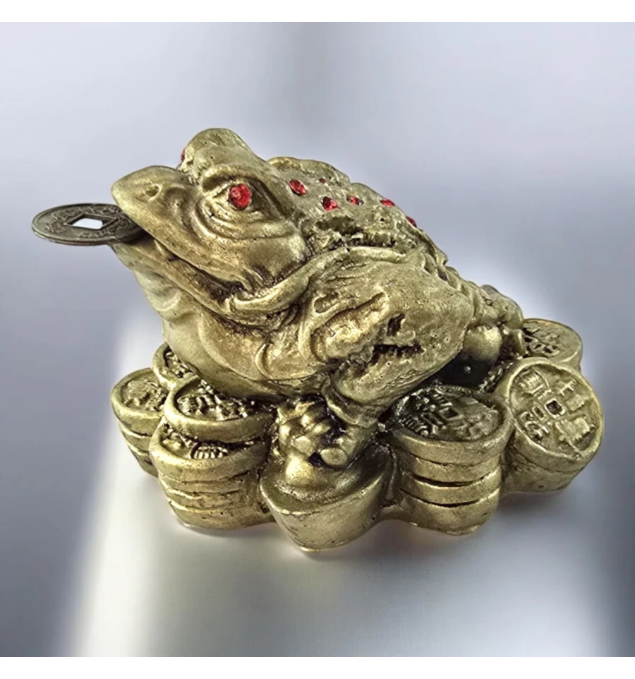 Ця статуетка золотистої триногої жаби з монеткою в роті - потужний символ успіху та багатства в китайському Фен-Шуй. Вона виготовлена з полімеру та виготовлена в Китаї. Висота статуетки становить 5,1 см, ширина - 7,5 см, глибина - 6,5 см, а діаметр монетки - 1,5 см. Вважається, що така жаба приносить фінансову удачу та сприяє зростанню добробуту.