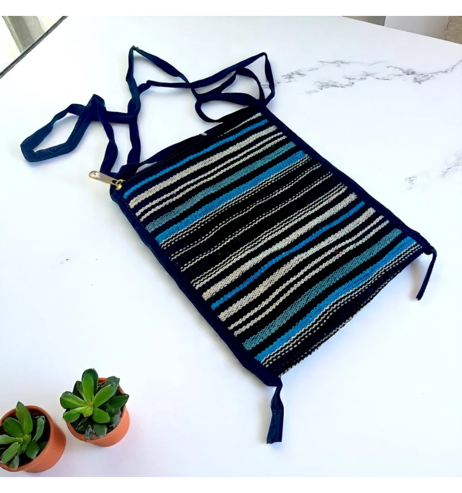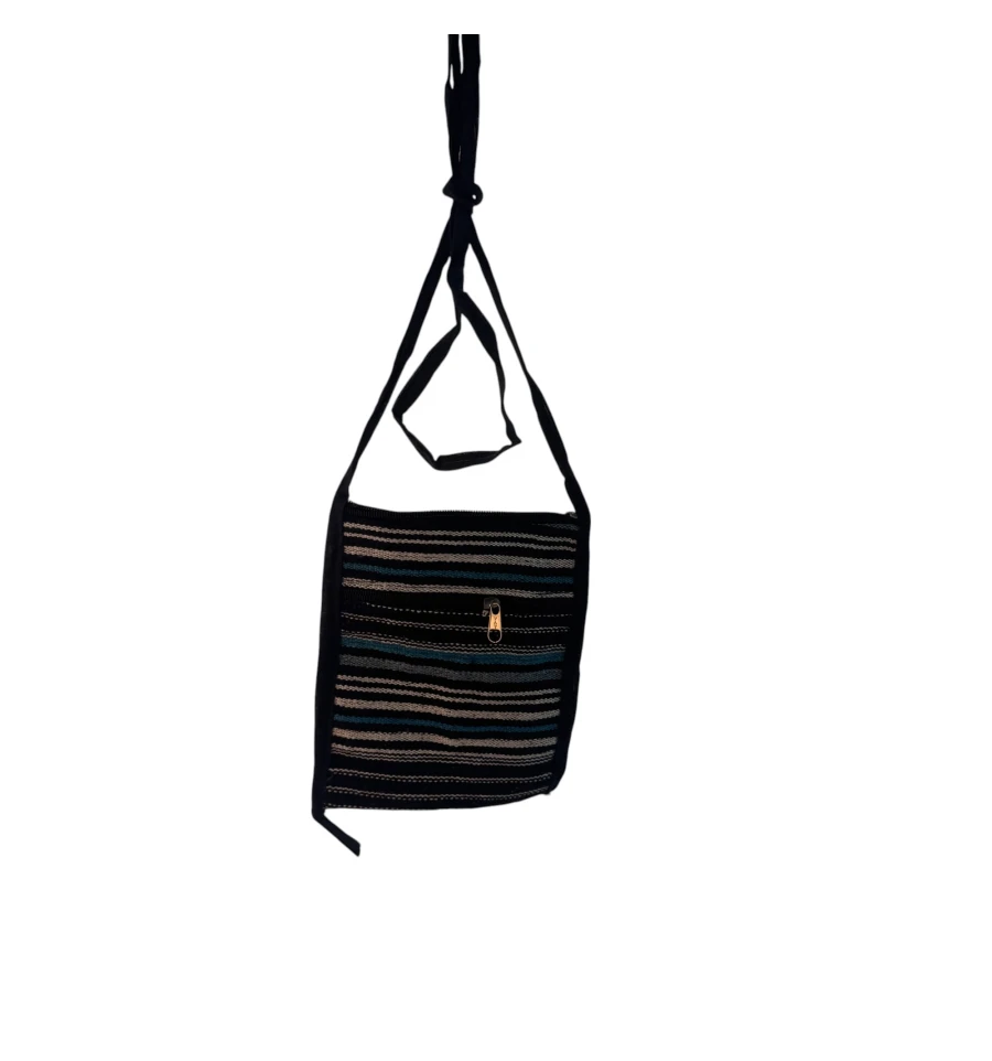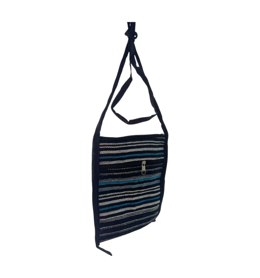 Яскрава та легка сумочка в етнічному стилі – чудовий аксесуар на кожен день або для подорожей. Зроблена в Індії, прикрашена кольоровими горизонтальними смугами, м'яка на дотик і зручна у носінні. Основний відділ застібається на блискавку, зовнішня кишеня, так само на блискавці, допоможе тримати під рукою дрібниці. Компактний розмір дозволяє носити її через плече або як кросбоді.