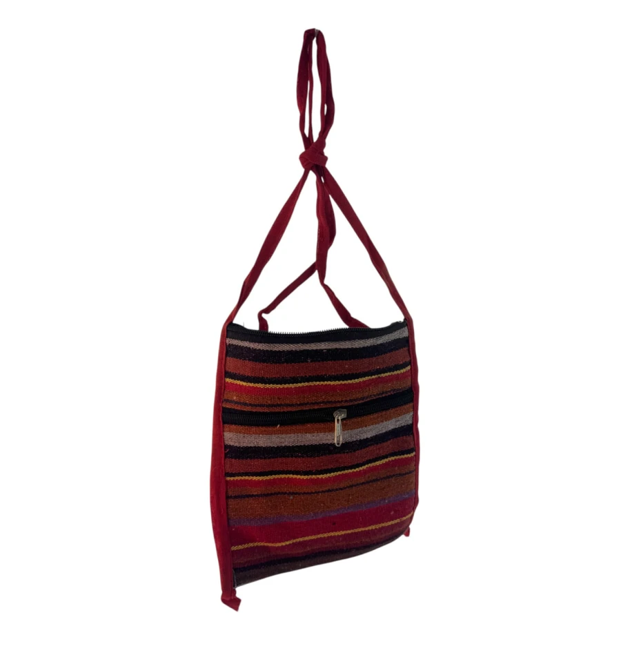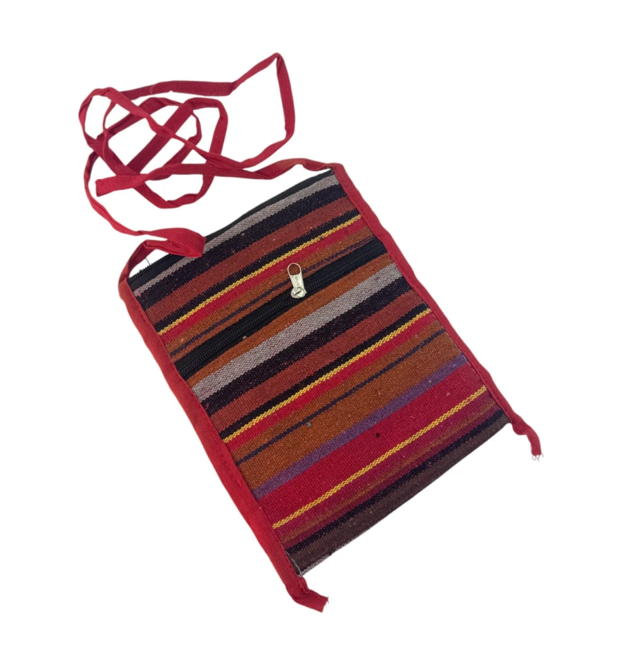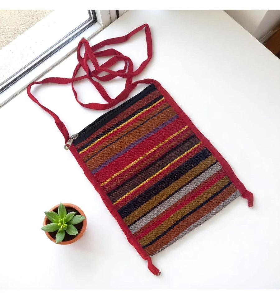 Яскрава та легка сумочка в етнічному стилі – чудовий аксесуар на кожен день або для подорожей. Зроблена в Індії, прикрашена кольоровими горизонтальними смугами, м'яка на дотик і зручна в носінні. Основний відділ застібається на блискавку, зовнішня кишеня, так само на блискавці, допоможе тримати під рукою дрібниці. Компактний розмір дозволяє носити її через плече або як кросбоді.