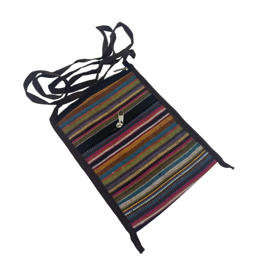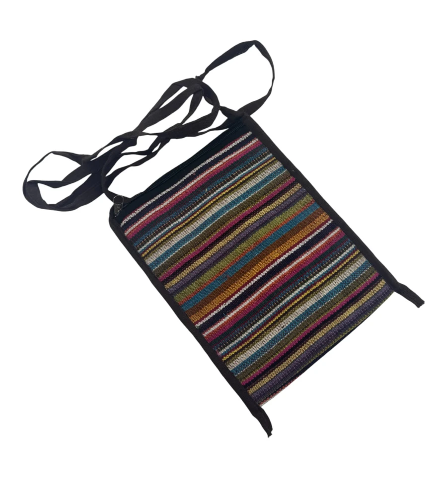 Яскрава та легка сумочка в етнічному стилі – чудовий аксесуар на кожен день або для подорожей. Зроблена в Індії, прикрашена кольоровими горизонтальними смугами, м'яка на дотик і зручна у носінні. Основний відділ застібається на блискавку, зовнішня кишеня, так само на блискавці, допоможе тримати під рукою дрібниці. Компактний розмір дозволяє носити її через плече або як кросбоді.