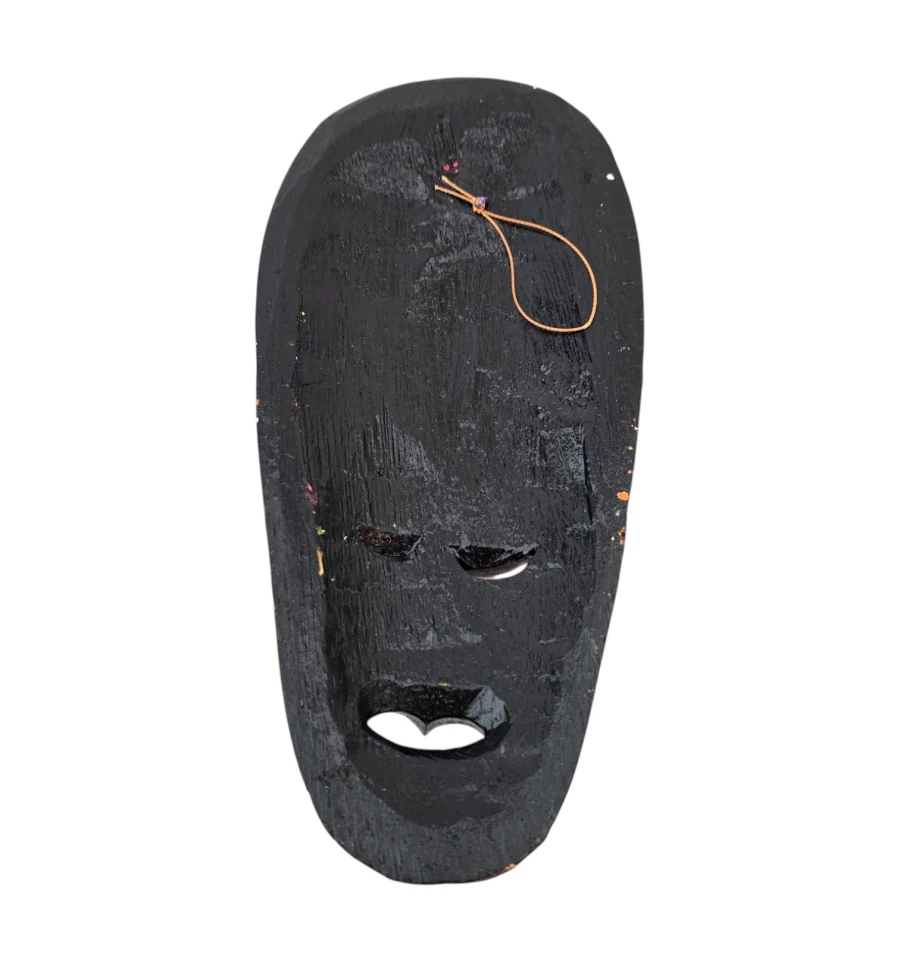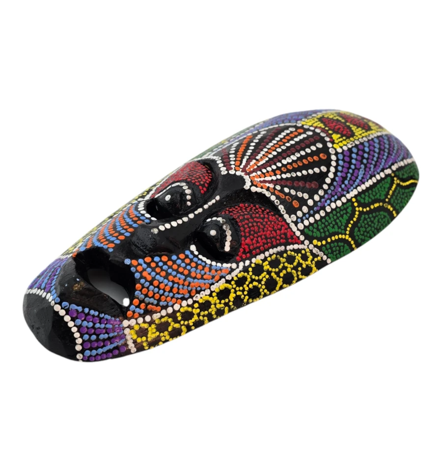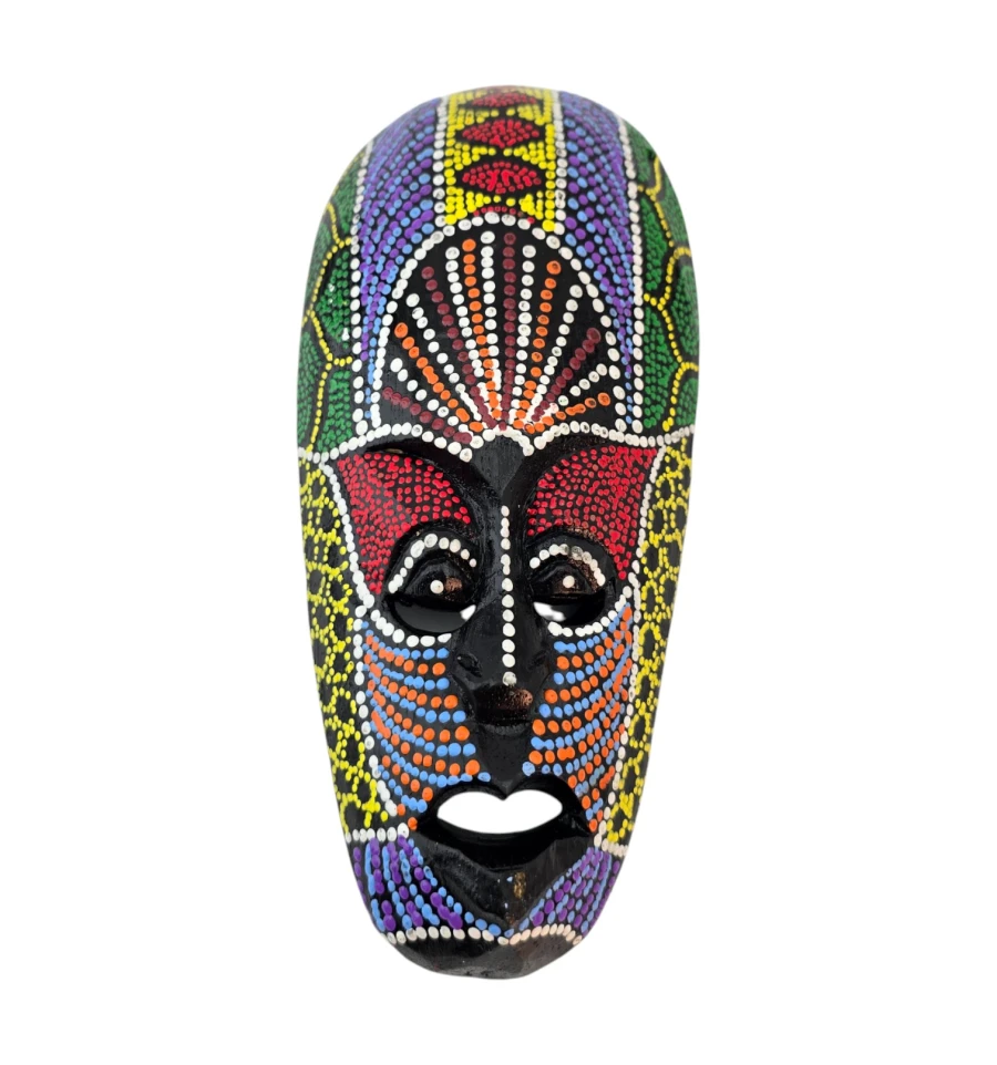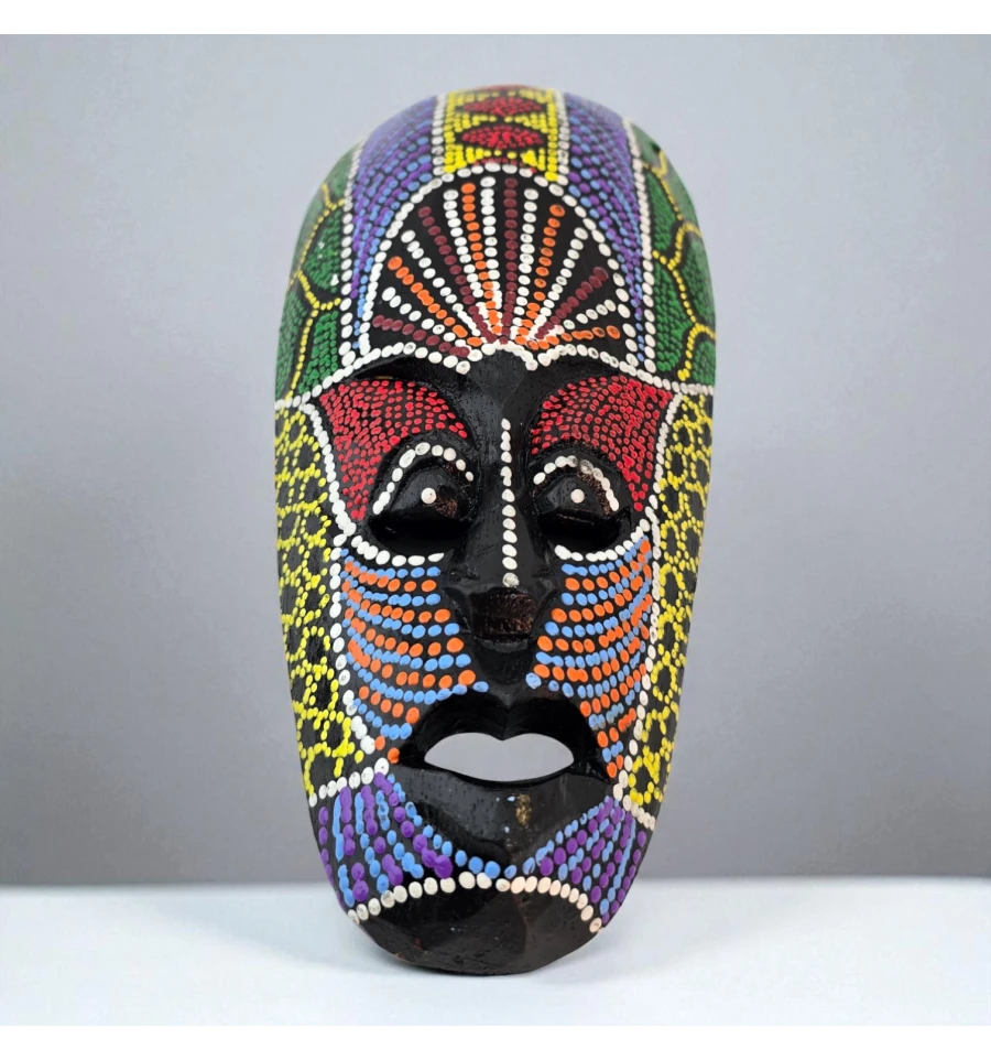 Настінна дерев'яна маска з яскравим точковим розписом у племінному стилі. Легка, зі шнурком для підвісу на звороті, підходить для декору вітальні, студії, кафе та фотозони. Добре поєднується з етнічними, бохо та тропічними інтер'єрами та працює як акцент у композиціях з панно та іншими масками.