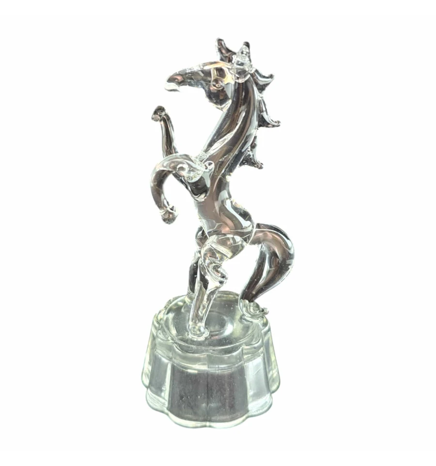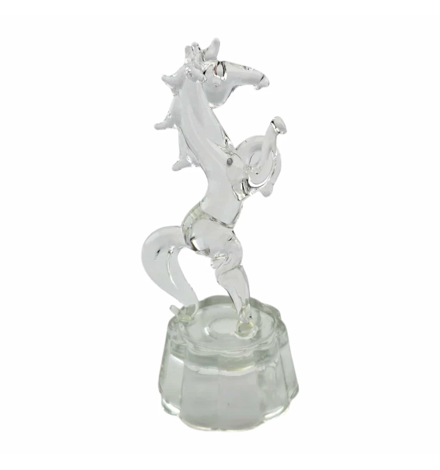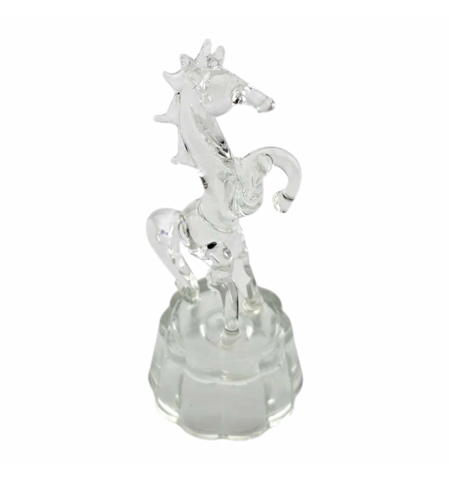 Мініатюрна кришталева фігурка коня, що встала дибки, на прозорій підставці. Чистий блиск кришталю та акуратне виконання роблять статуетку помітним акцентом на полиці, камінній полиці або робочому столі. Відмінний сувенір та невеликий подарунок для любителів витонченого декору.