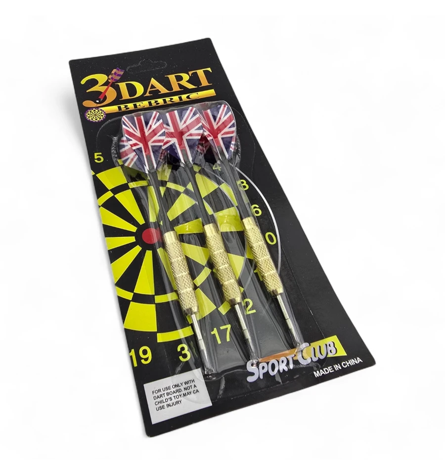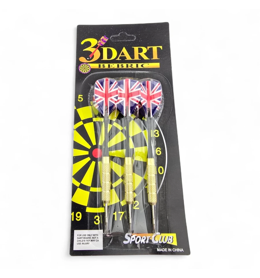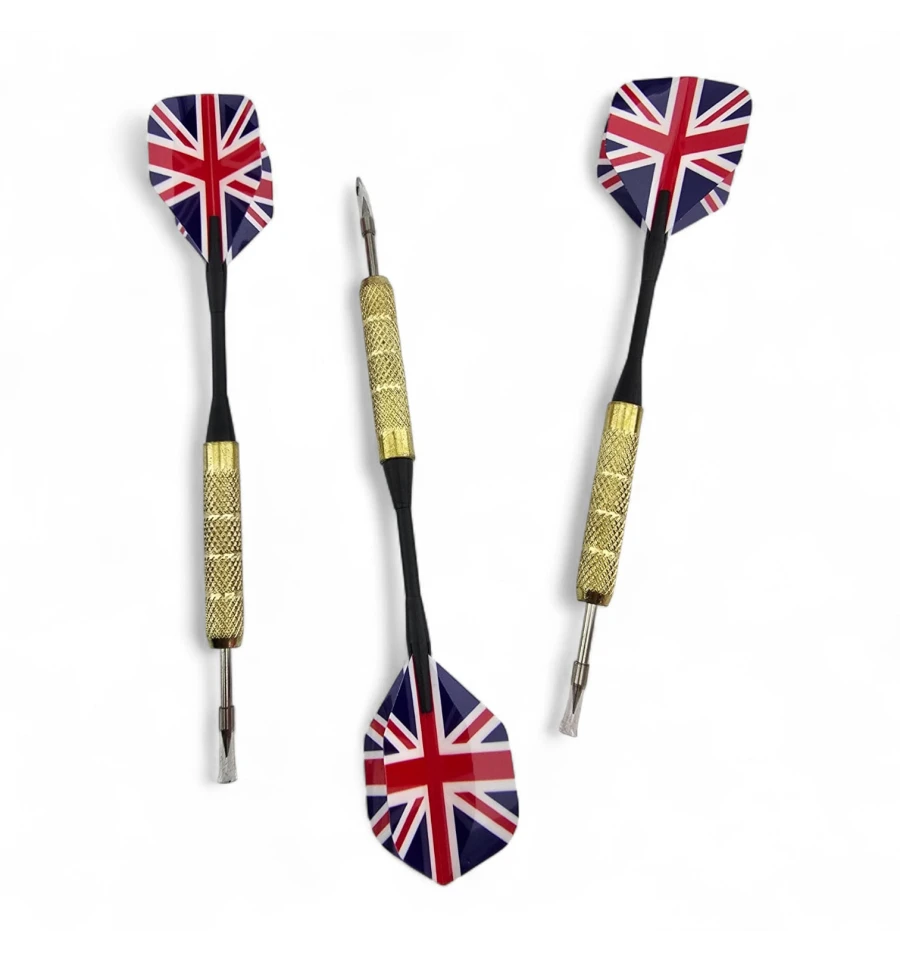 Набір з 3 дротиків для гри в дартс вдома або в барі. Металевий гострий наконечник забезпечує впевнене влучення в класичні мішені, рифлений металевий корпус зручний у хваті, оперення Union Jack стабілізує політ. Розбірна конструкція дозволяє змінювати хвостовик та оперення. Рекомендується для пробкових або сизалевих мішеней, не підходить для магнітних.