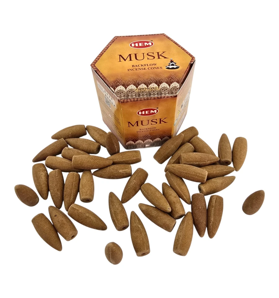 HEM Musk – ароматичні конуси Backflow з теплим мускусним ароматом від індійського виробника HEM. Зі спеціальною підставкою Backflow дим гарно струмує вниз, створюючи ефект водоспаду. Підходять для ароматизації будинку, розслаблення, медитації та як готовий подарунок.