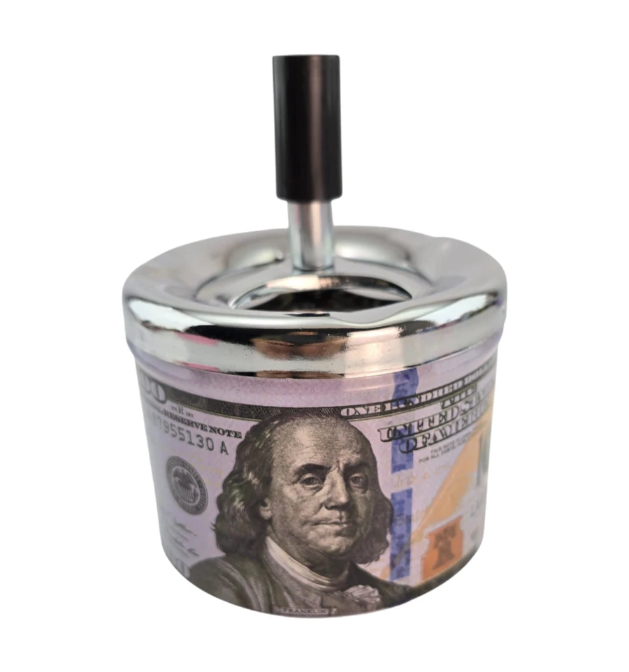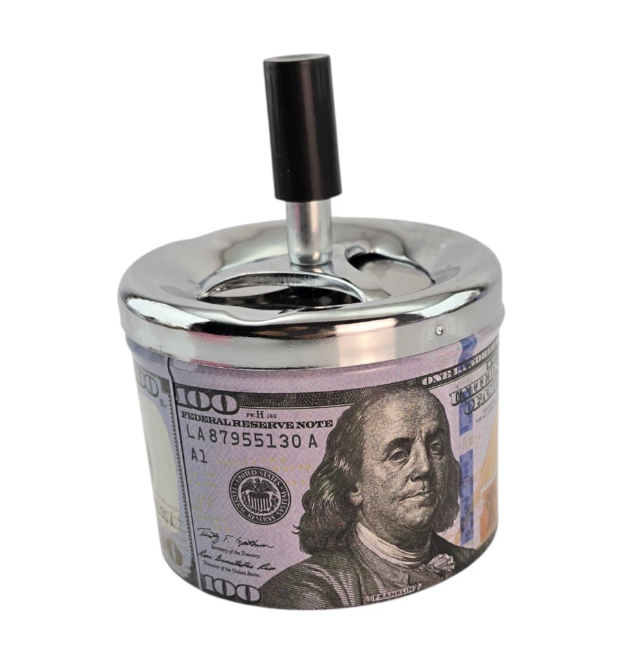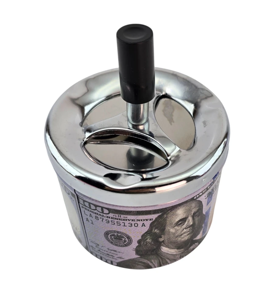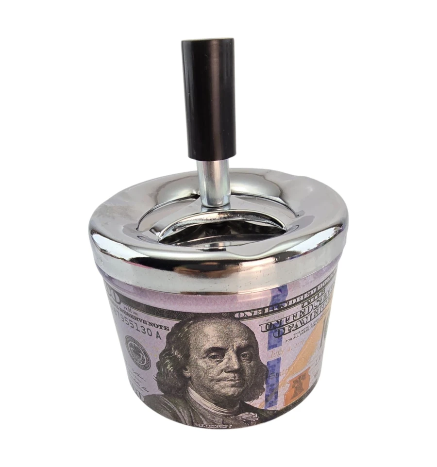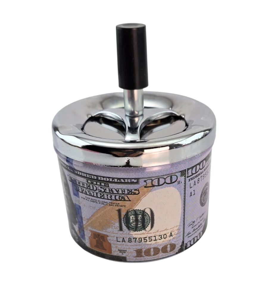 Ефектна попільничка з принтом банкноти $100 та push-down механізмом. Натисніть кнопку - внутрішній диск провертається і опускає попіл і недопалки всередину, що знижує запах і дає попелу розлітатися. Міцний металевий корпус легко очищається та стильно виглядає вдома, в офісі чи барі. Відмінний практичний подарунок та яскравий елемент інтер'єру.