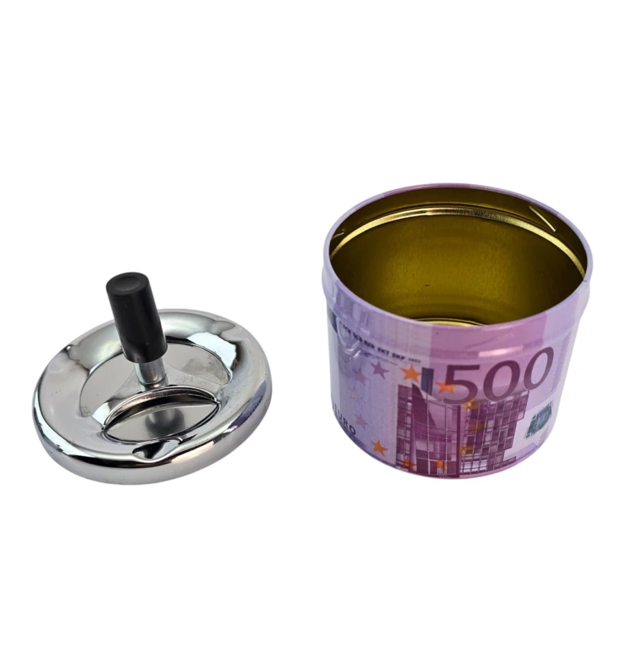 Стильна попільничка зі спіральним механізмом у дизайні «500 Євро». Натисніть кнопку - попіл і недопалки провалюються всередину, на столі чистіше і менше запаху. Металевий корпус стійкий до нагрівання та легко очищається. Компактний розмір зручний для дому, офісу, бару або тераси – ще й як кумедний подарунок курцеві.