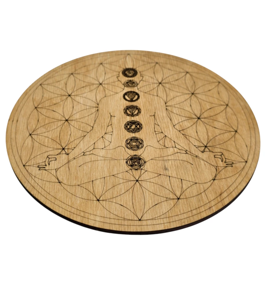 Кругла дерев’яна дошка з гравіюванням сакрального символу «Квітка Життя», фігури людини в медитативній позі та семи чакр. Виріб виготовлений із натурального дерева та оздоблений тонким лазерним гравіюванням, яке підкреслює геометрію й символіку візерунка.