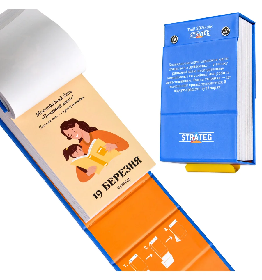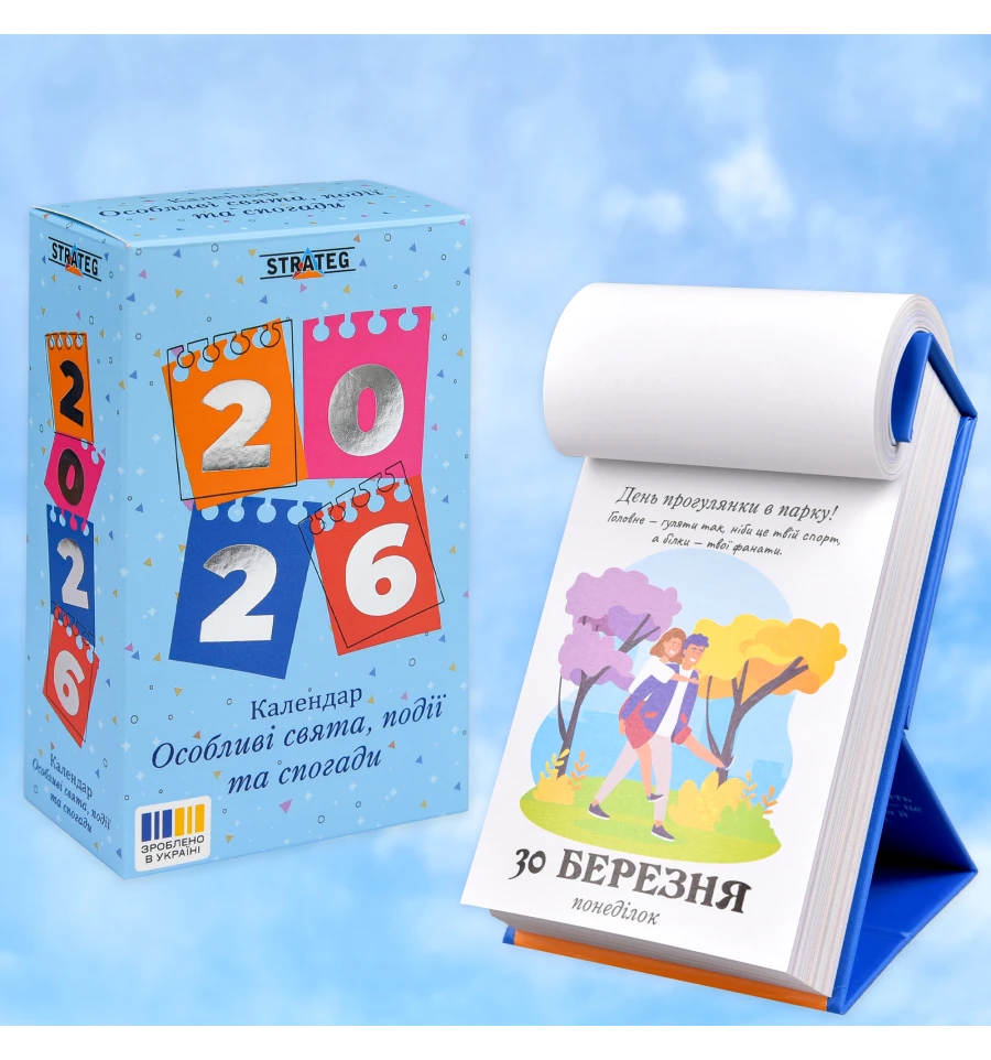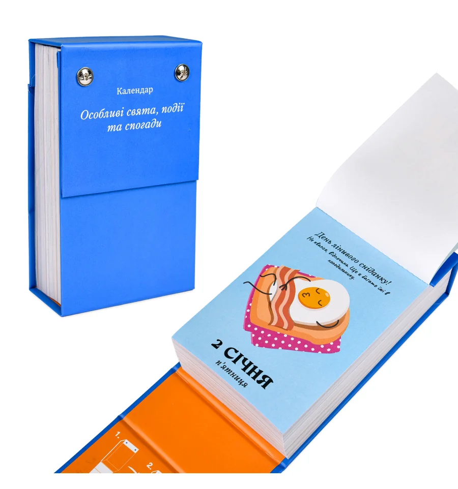 Цей календар — про вміння помічати життя в деталях.«Особливі свята, події та спогади» створений для тих, хто цінує моменти, настрій і теплі паузи серед щоденних справ.Кожен день тут — не просто дата, а привід зупинитися, усміхнутися, згадати або відчути щось важливе. У цьому календарі немає «звичайних буднів» — кожна сторінка має свій сенс, характер і настрій.Щоденне відривання аркуша поступово перетворюється на приємну особисту традицію: маленький ритуал, який допомагає звернути увагу на сьогоднішній день і прожити його усвідомлено.