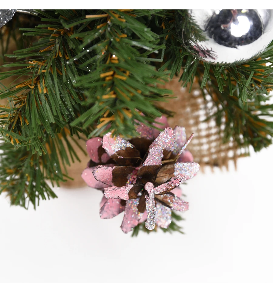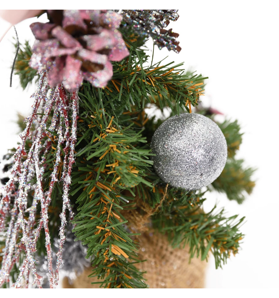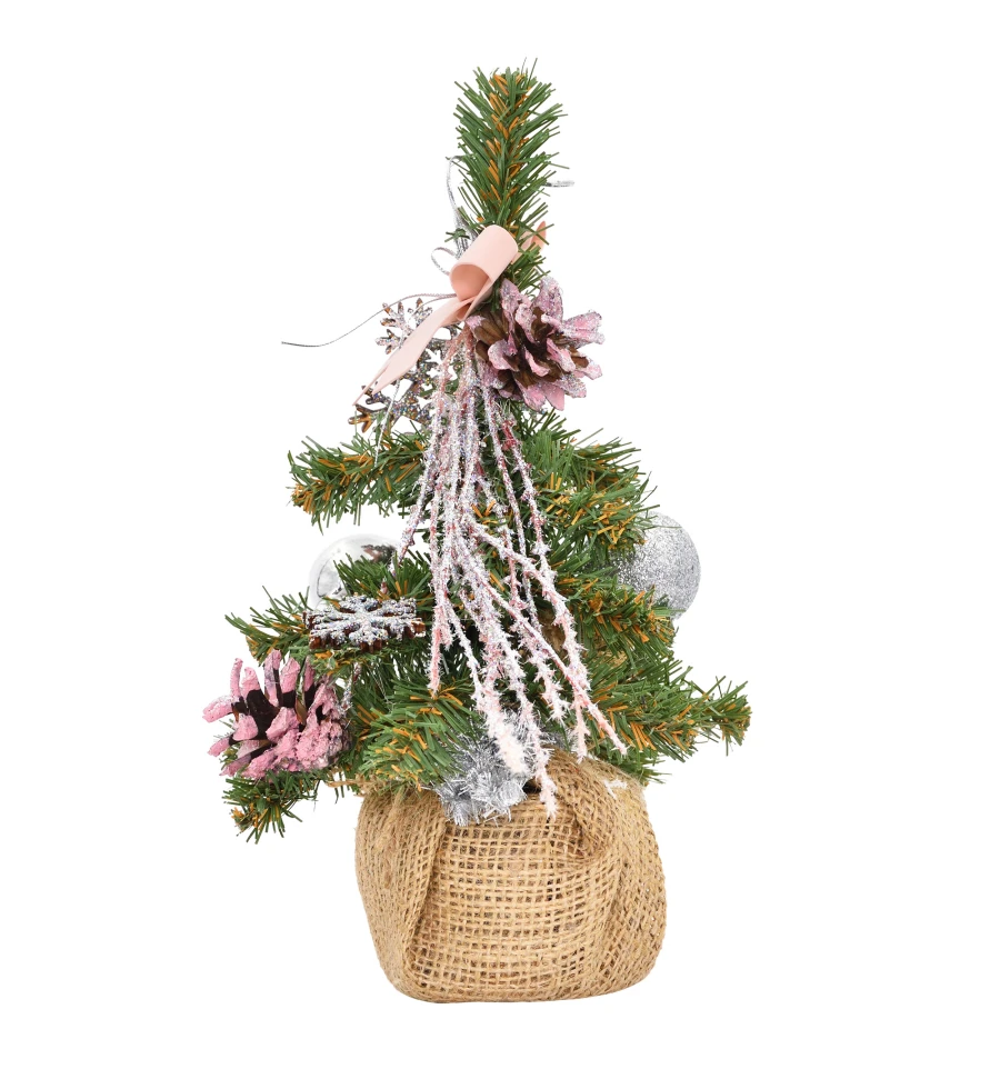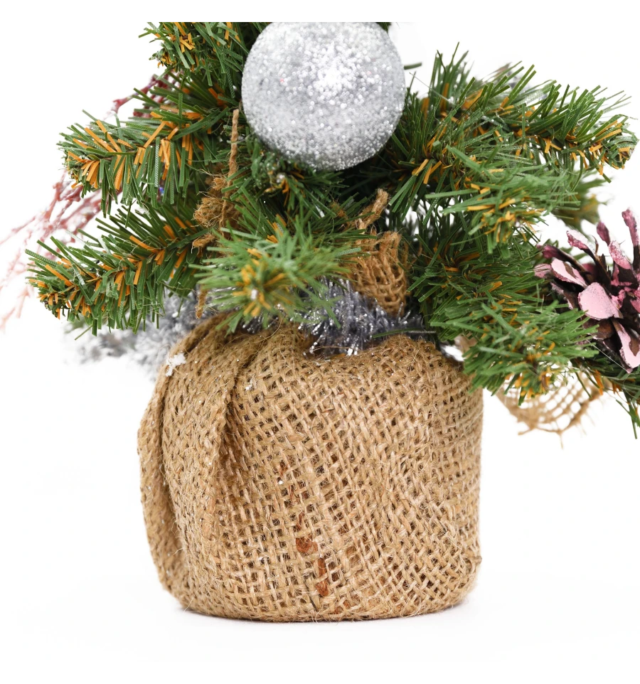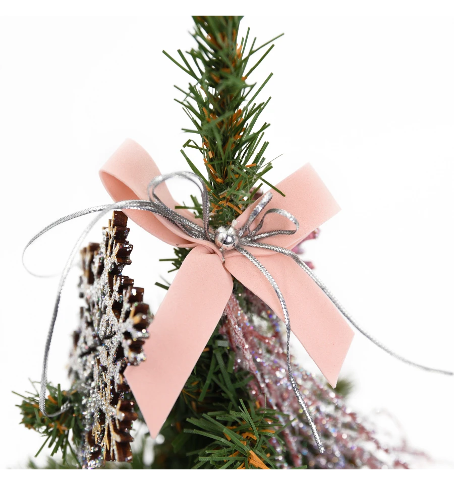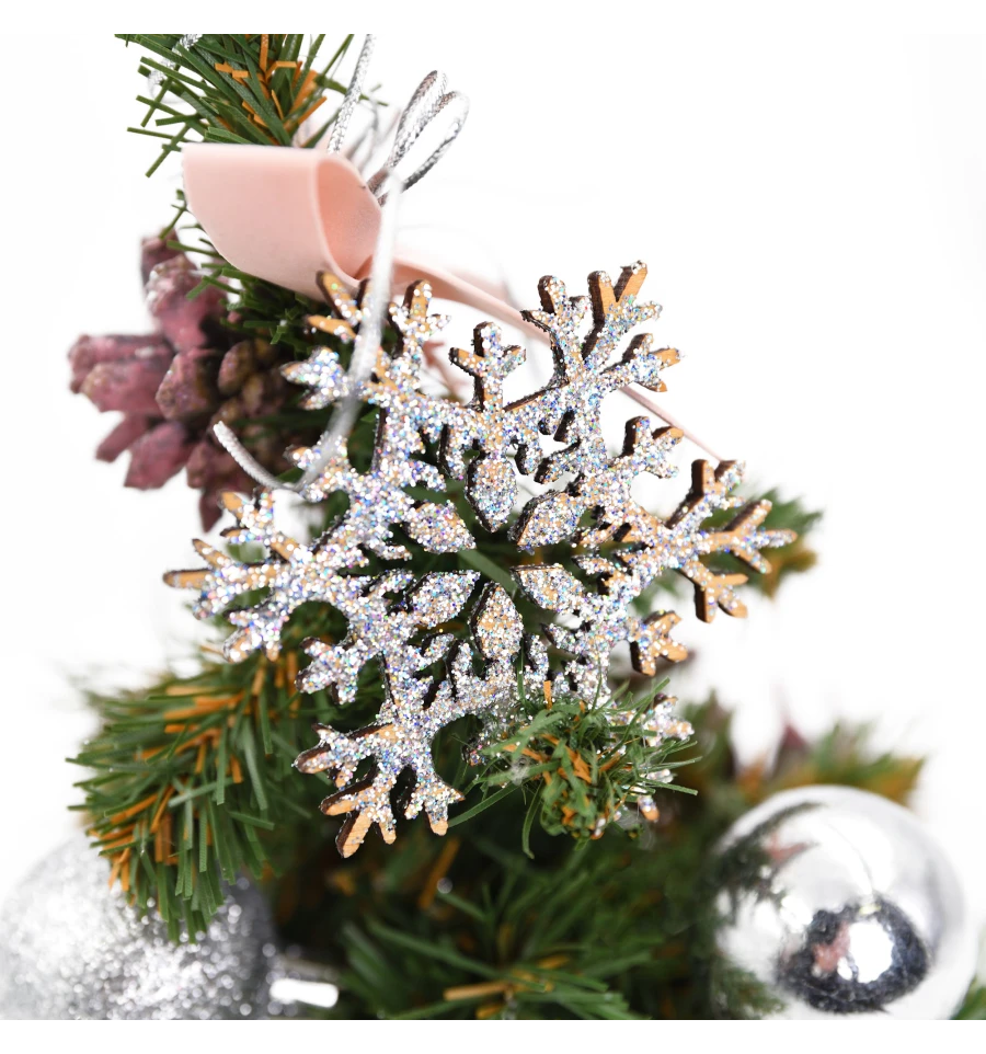 Маленька компактна ялина з яскравими бантами і гілками, виконаними в одному кольорі, а також з фанерною сніжинкою, покритою сріблястим глітером, стане чудовою прикрасою приміщення у період новорічних і різдвяних свят. Висота композиції: 25 см. Габарити: 0,25 м.