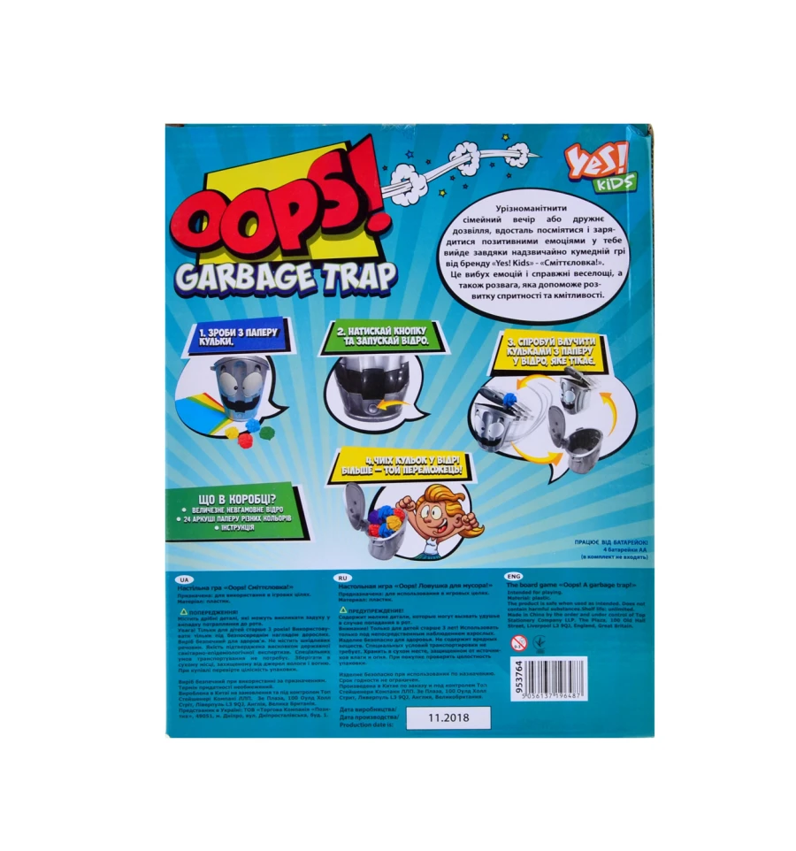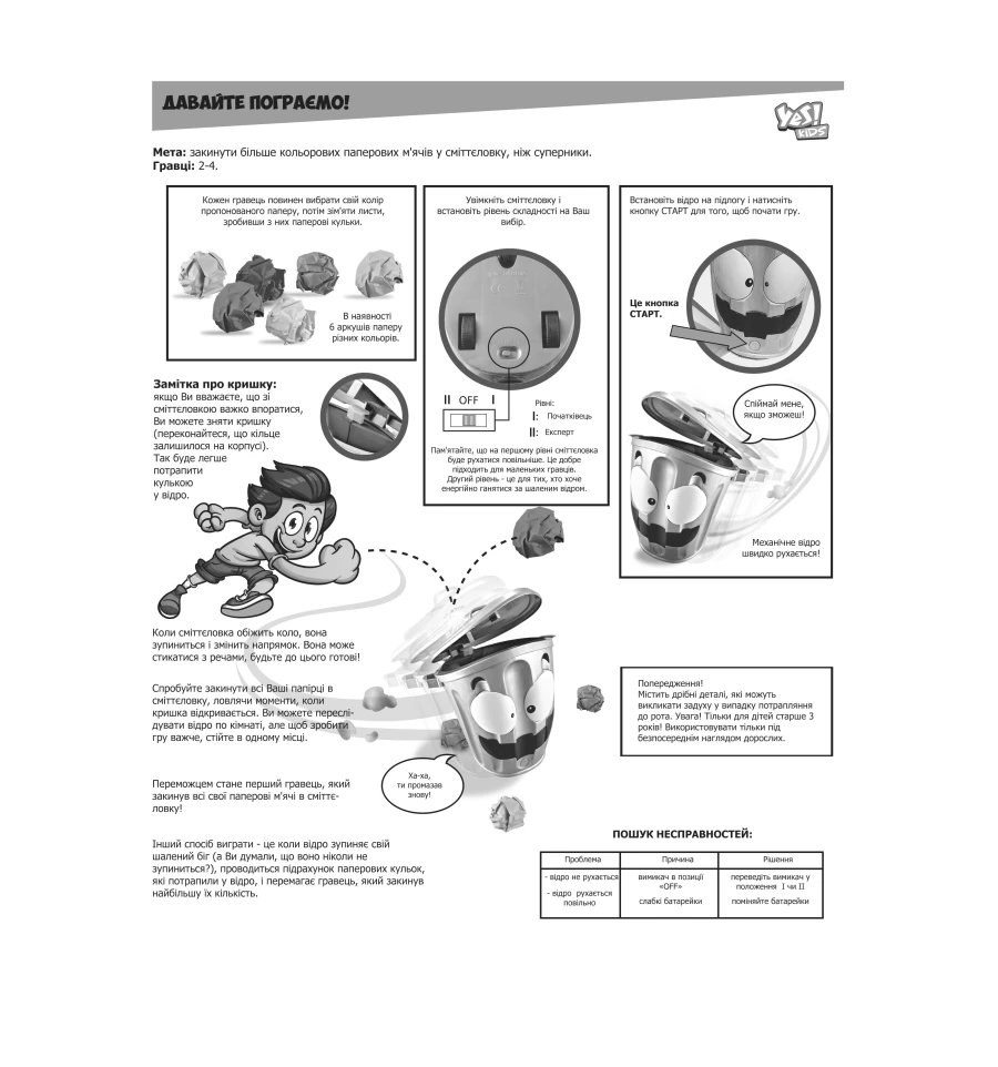 Захоплююча гра, куплена дитині, може стати розвагою для усієї сім‘ї! Тільки уявіть: відро для сміття, що тікає, в яке треба потрапити "бомбою" з паперу прямо на ходу! Невелике відро для сміття на батарейках їздить на підлозі, намагаючись "втекти" від гравців. Для гри досить лише вставити чотири батарейки в нижню частину відра, включити тумблер на дні та зробити "бомби" з паперу. Виграє той, хто влучить всередину відра найбільшу кількість разів. У наборі шість листів паперу чотирьох різних кольорів.