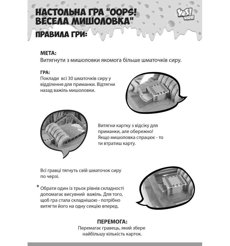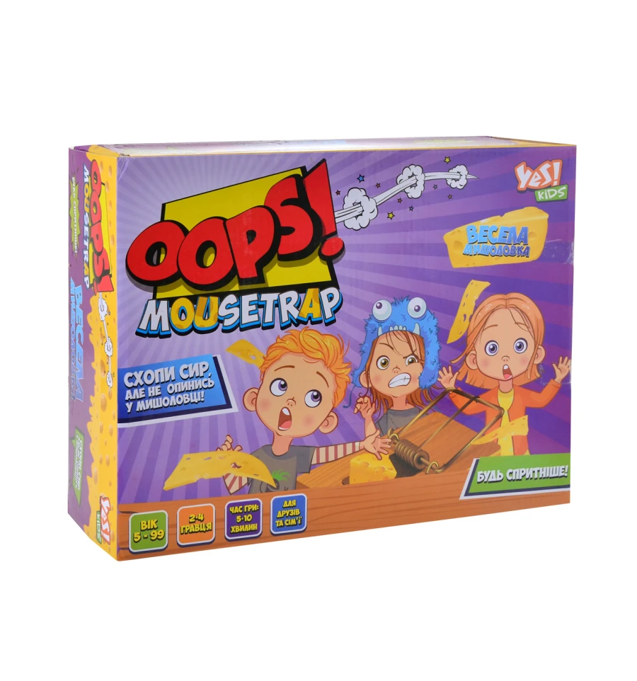 Дуже проста і захоплююча гра для дітей з 4 років! Набір розвиває спритність і швидкість реакції - треба як можна акуратніше витягнути "шматочок сиру" із мишоловки, не потрапивши у неї. Набір містить пластикову мишоловку, тридцять (30) карток із зображенням сиру, а також інструкцію. Для гри дитині необхідно лише покласти паперові картки "шматочок сиру" в мишоловку і вибрати рівень складності. Після цього треба буде відтягнути назад важіль і спробувати витягнути сир, не попавши у пастку.