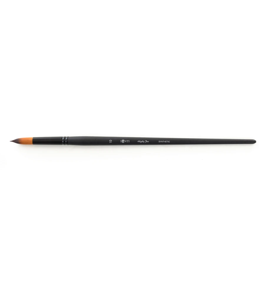 Круглі пензлі «Santi Highly Pro» відрізняються чудовою якістю синтетичного ворсу, особливою еластичністю і пружністю волосяного пучка. Представлені на довжиною ручці, захищеної матовим лаком. Дуже добре підходять для роботи з усіма видами фарби. Міцна обойма надійно зафіксована на держаку завдяки професійному клею і обтиску. Призначені як для створення фактури, так і для роботи над деталями, промальовування товстих і тонких ліній.